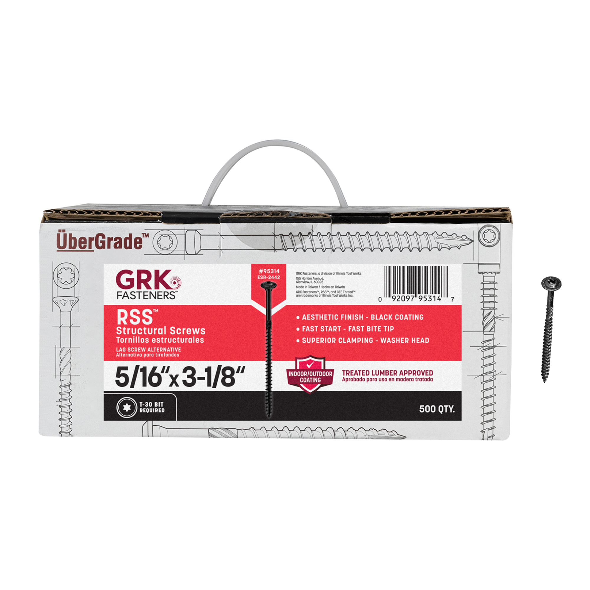The GRK RSS Rugged Structural Wood Screw is a professional-grade fastener designed for heavy-duty framing, decking, and construction projects. These premium screws deliver superior performance in applications, including deck building, timber framing, laminated beams, pole barns. GRK’s Black Climatek™ coating, provides exceptional corrosion resistance, making these construction screws ideal for pressure-treated lumber, cedar, and all other wood applications. The patented Fast Bite Tip and Zip-Tip™ technology eliminates the need for pilot holes, while the W-Cut™ design ensures smooth, low-torque driving in all wood types. ICC-ES ESR-2442 approved for structural applications, these self-drilling screws are trusted by professional builders and DIYers alike. The star drive head with 6-points of contact prevents cam outs and head stripping, making these wood screws the choice for demanding construction and home improvement projects.