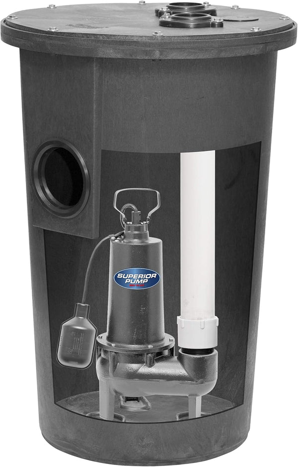 Superior Pump 93015-U Cast Iron Tethered Float Switch Sewage Pump with Basin Kit, 1/2 HP, Black