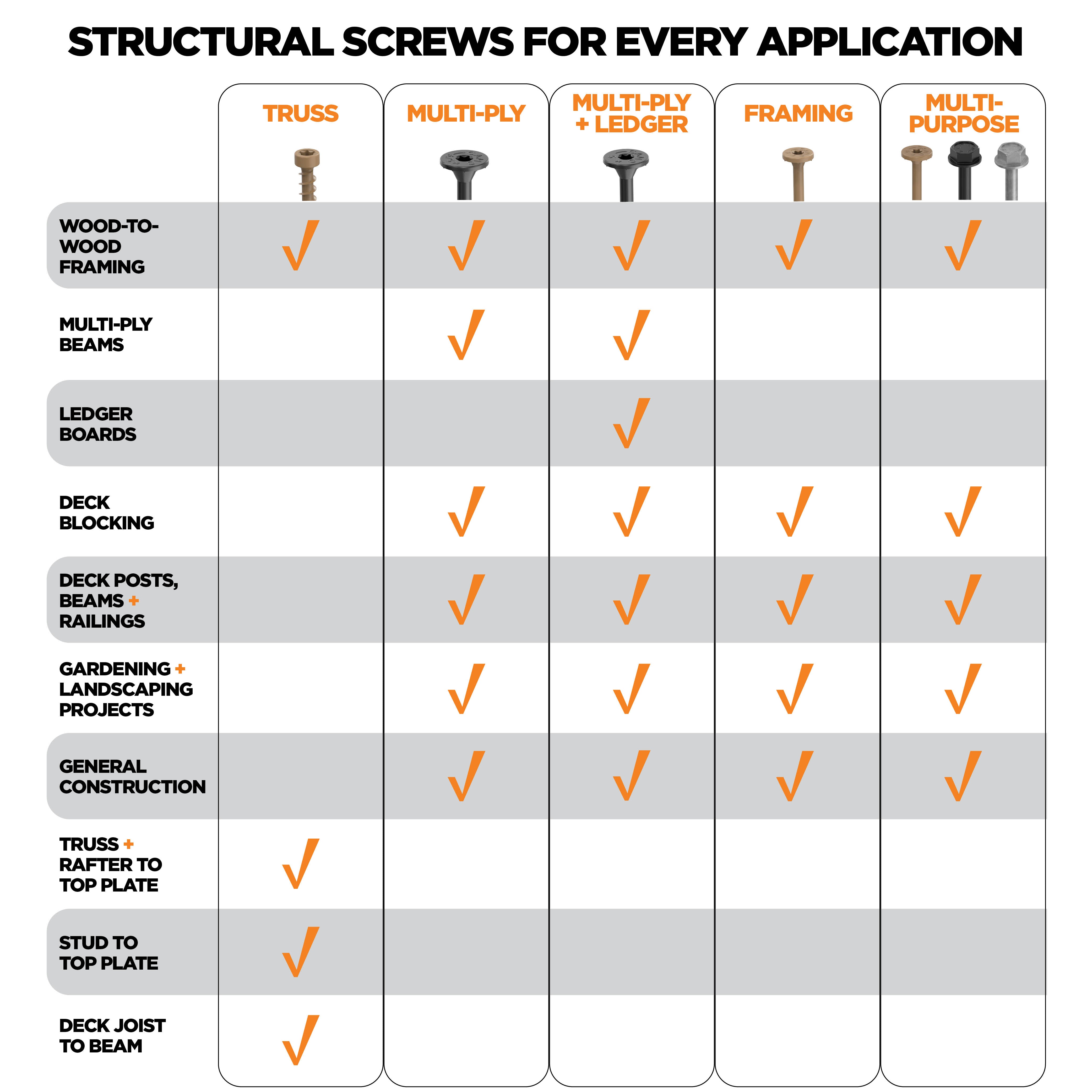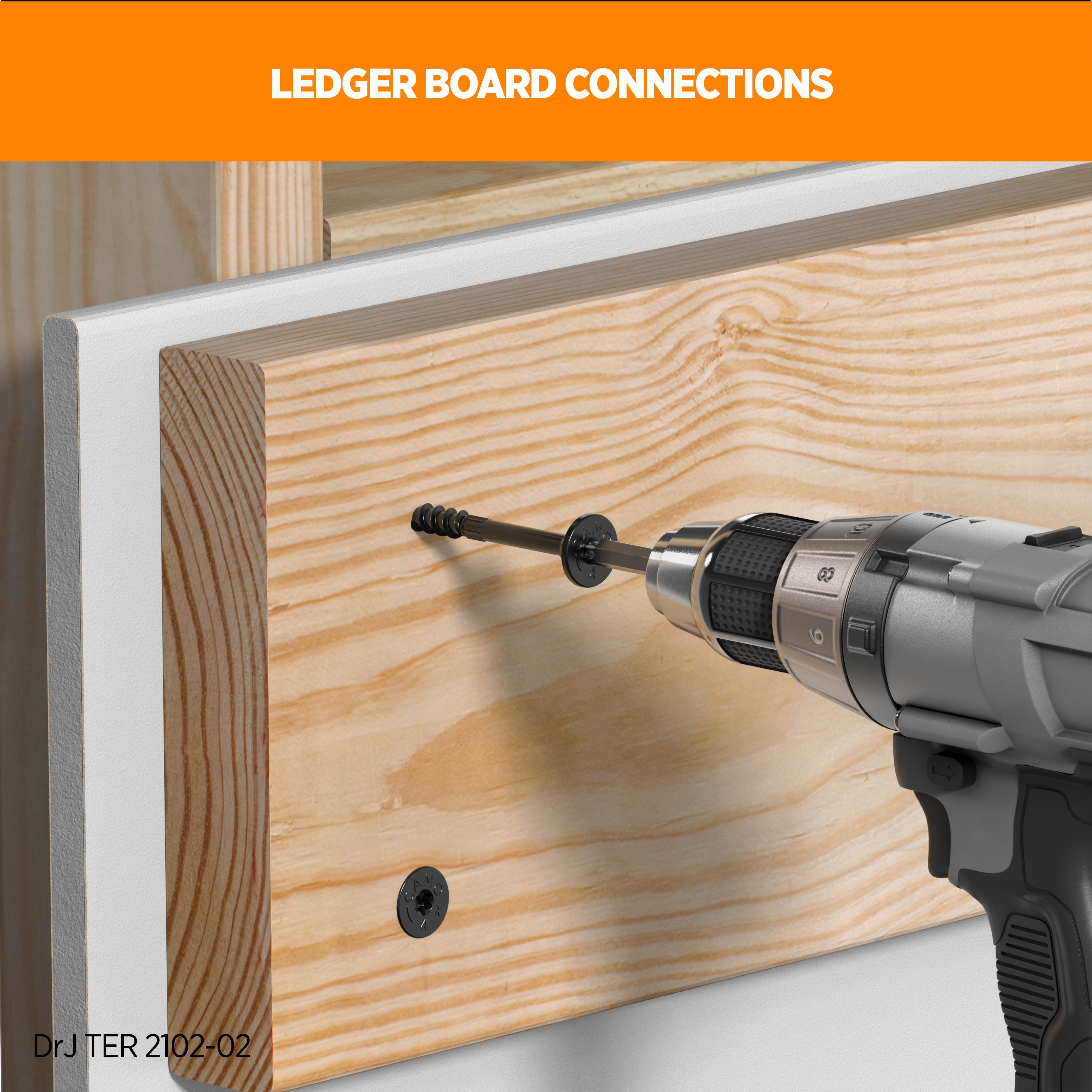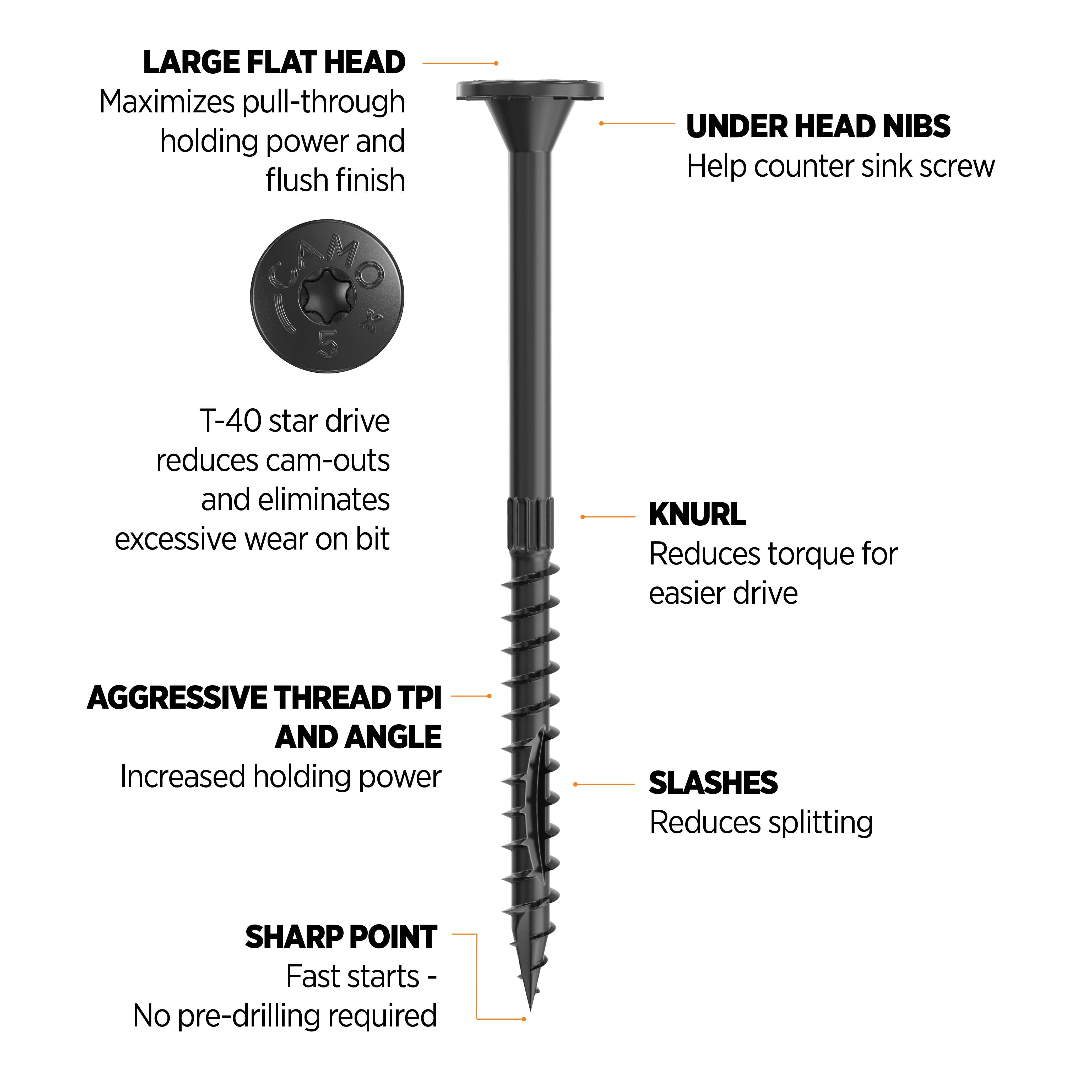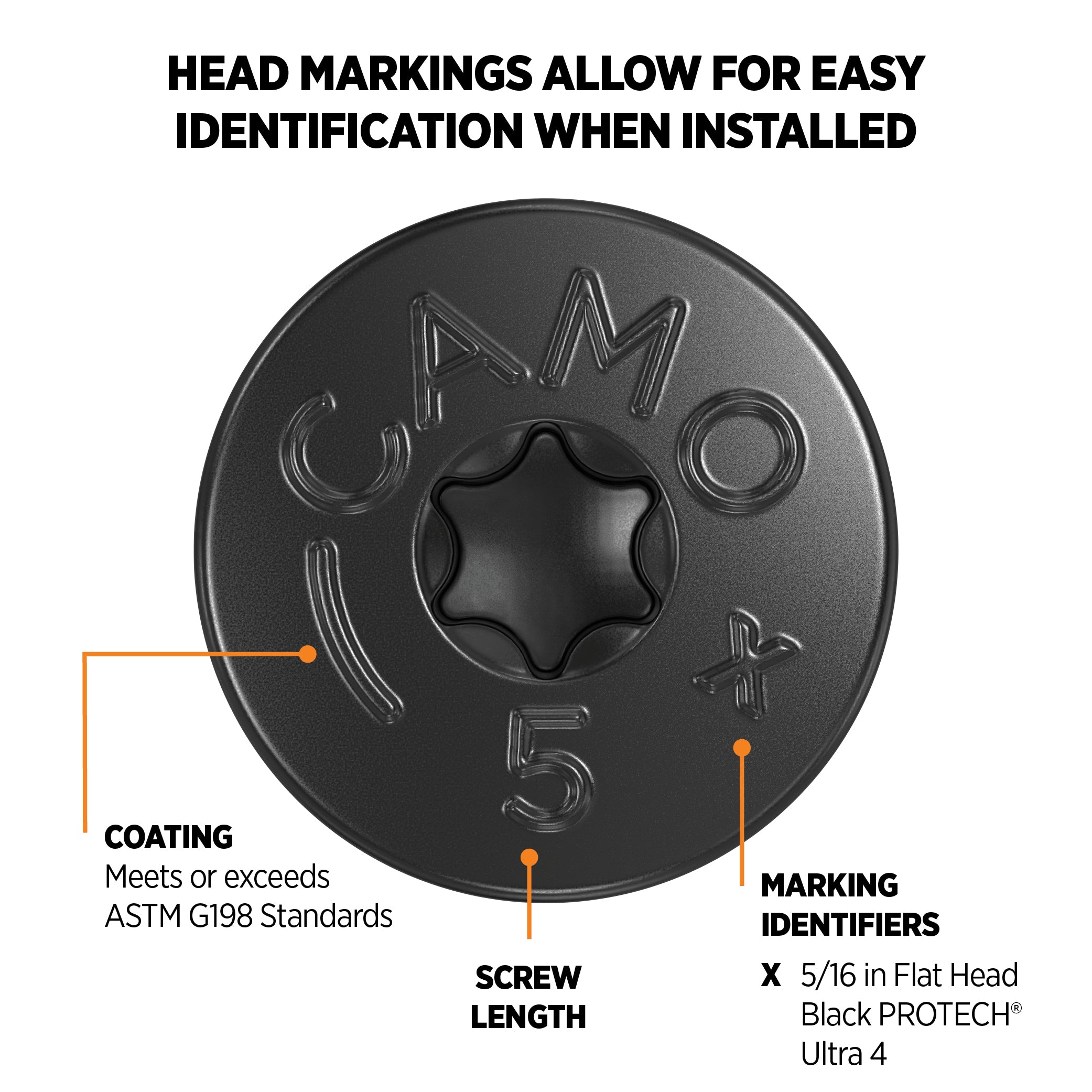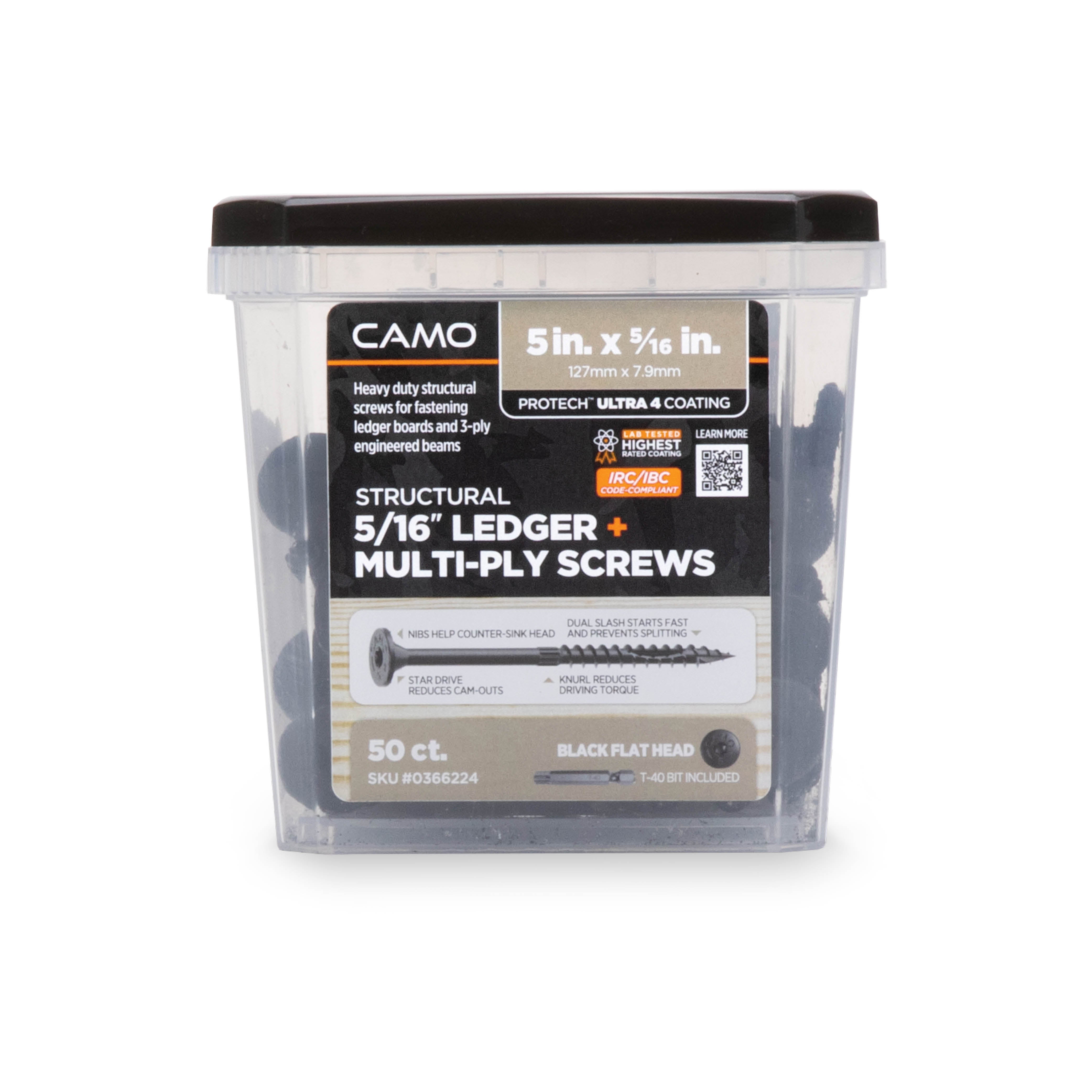 Code-compliant and exterior-coated, CAMO 5/16 in. Multi-Ply Screws hold strong and finish flush in a variety of applications. Our 5 in. Multi-ply plus Ledger screw is specifically designed to fasten ledger boards and 3-ply engineered beams. They can also be used as a replacement for 1/2 in. lag screws in general construction projects. These screws feature our industry-leading PROTECH Ultra 4-layer coating system, offering superior corrosion resistance for long-lasting connections. CAMO Structural screws are engineered to start fast, drive easy and finish flush so you can get the job done and get on your way.