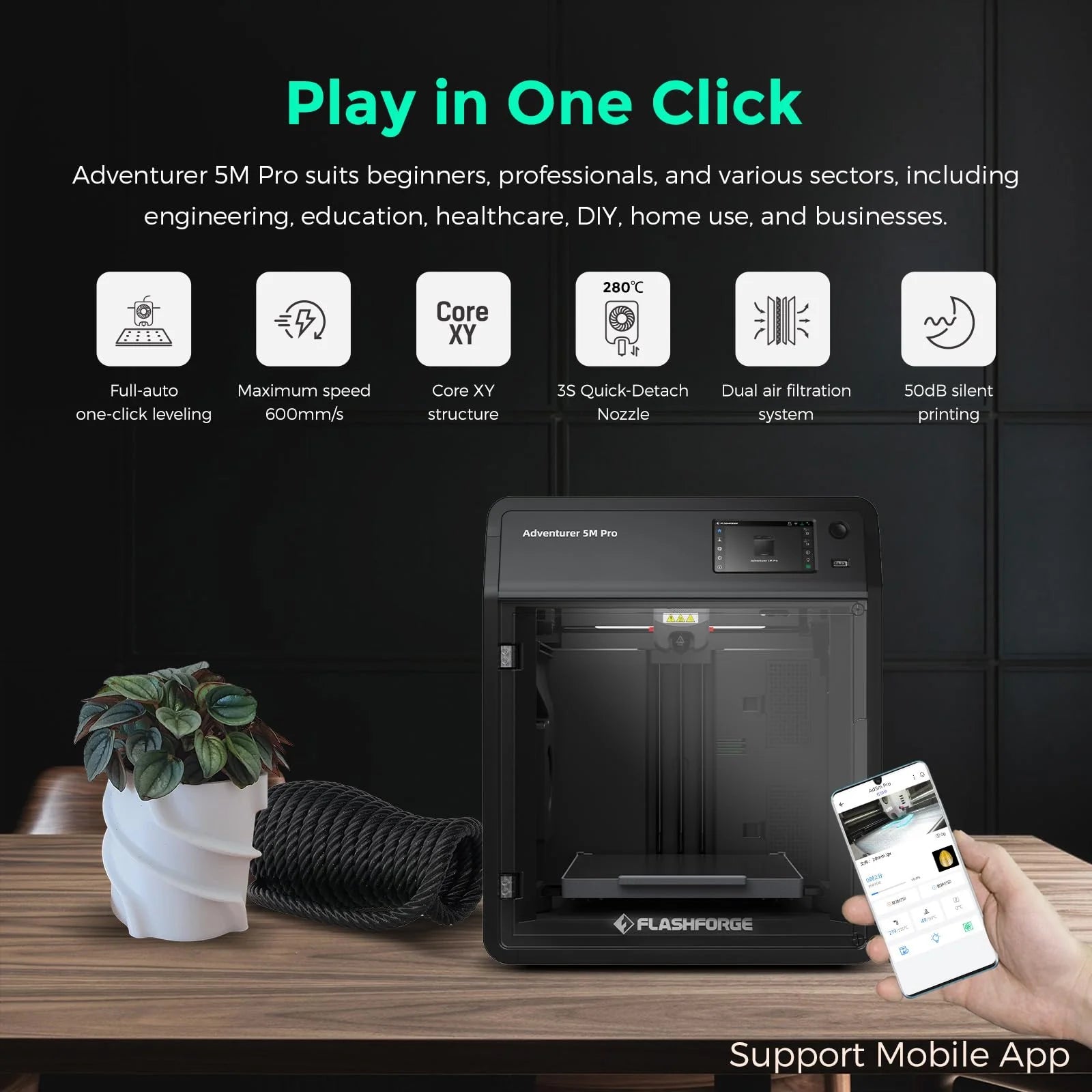 Welcome to the future of 3D printing with our revolutionary Adventurer 5M Pro. 1. Perfect First Layer with 1-Click Auto-Leveling System With a simple click, you could effortlessly achieve perfect bed leveling. Ensuring that the first layer is flawless and perfect. 2. High-Speed Printing With 12X high-speed printing at 600mm/s and an astonishing acceleration of 20000mm/s², you could transform your ideas from thought to reality in an instant. In less than 10 minutes, from unboxing to starting the print. 3. Intelligent Design, Multi-Material Compatibility The rapid 3-second nozzle change system, supporting 0.25mm, 0.4mm, 0.6mm, 0.8mm specifications, pairs seamlessly with the 280℃ direct extruder, offering a wide material range (PLA, ABS, PETG, ASA, TPU, PC, PLA-CF, PETG-CF). 4. Vibration Compensation System The printer is equipped with an advanced vibration compensation system, providing a solid foundation for your creations. This means that even during high-speed printing, your works can maintain exceptional quality. 5. Additional Features for an Enhanced Printing Experience With a core XY all-metal structure, a 220×220×220mm printing volume, internal and external circulation systems, power-off resume, filament detection, automatic on/off, double-sided PEI platform, silent printing, and a 4.3-inch touchscreen, every function provides perfect support for your creations. Whether you are a professional designer or a beginner interested in 3D printing, our 3D printer will take you on an unparalleled creative journey.