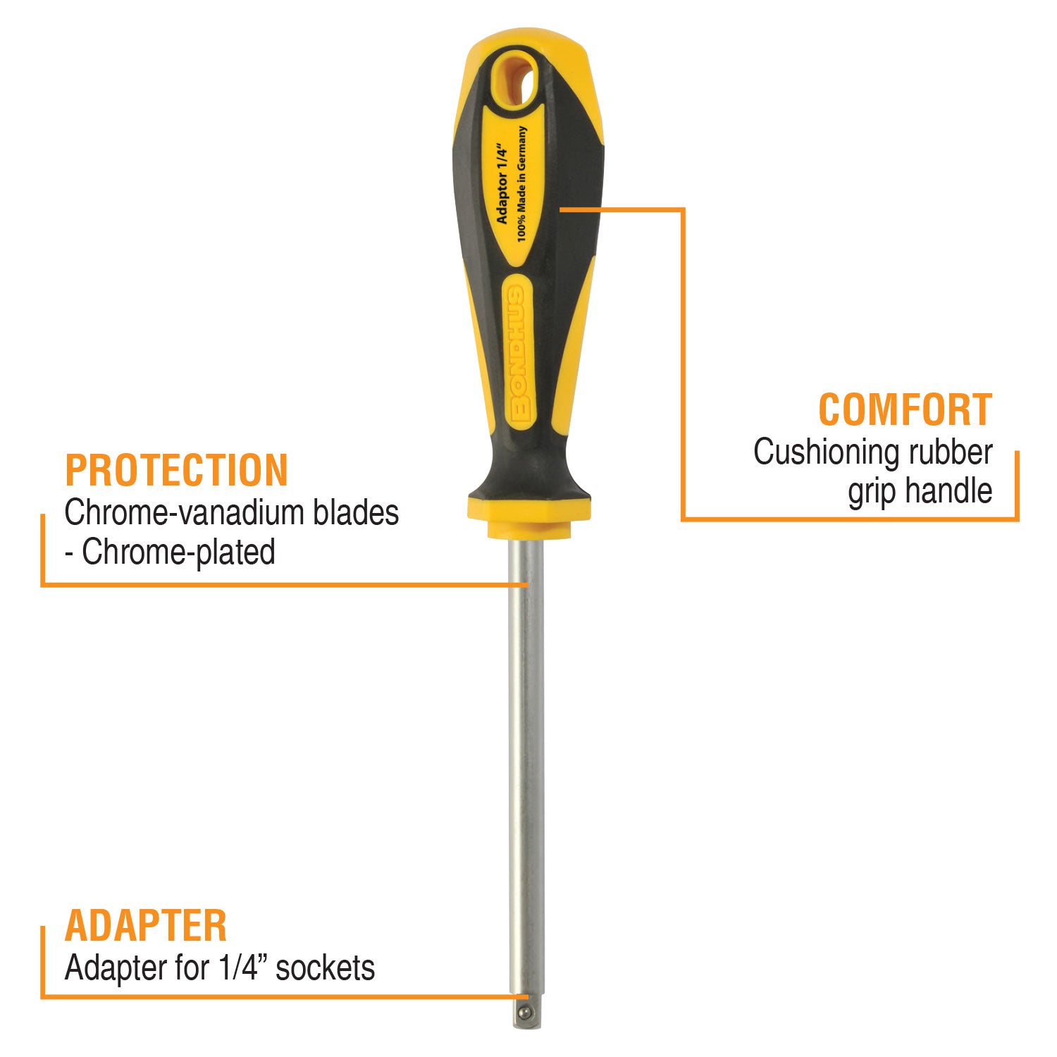 Provides outstanding comfort grip in a 2-component ergonomic design. Adapter for 1/4" sockets. Chrome-plated blade for superior corrosion resistance.