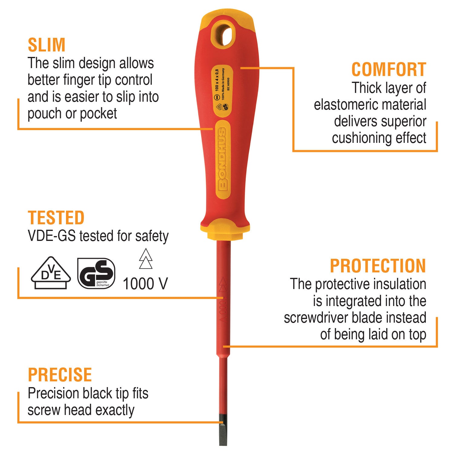 Slim design allows better finger tip control in low torque situations. Tested at 10,000 volts and Rated for use to 1,000 volts. The protective insulation is integrated into the screwdriver blade instead of being laid on top. Precision black tip fits screw head exactly.