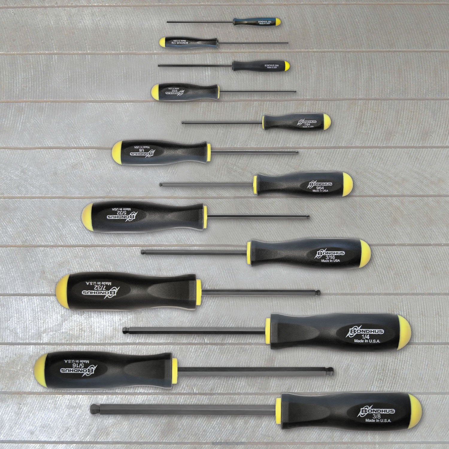 Introducing the Bondhus 10637 Set of 13 Balldriver Screwdrivers, the ultimate toolkit for professionals and DIY enthusiasts alike. With sizes ranging from .050 to 3/8", this versatile set is designed to meet all your screwdriver needs.
