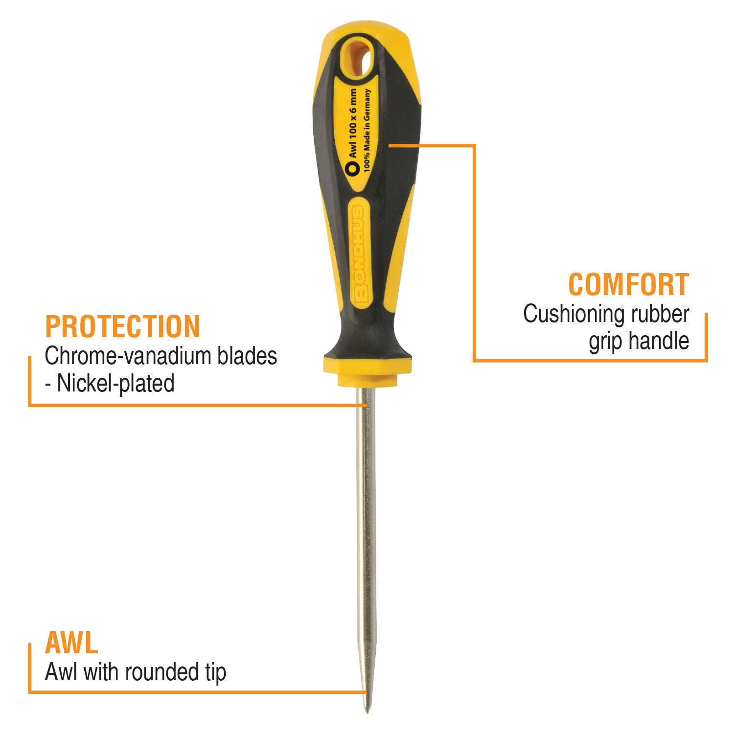 Provides outstanding comfort grip in a 2-component ergonomic design. Awl with round tip. Chrome-plated blade for superior corrosion resistance.