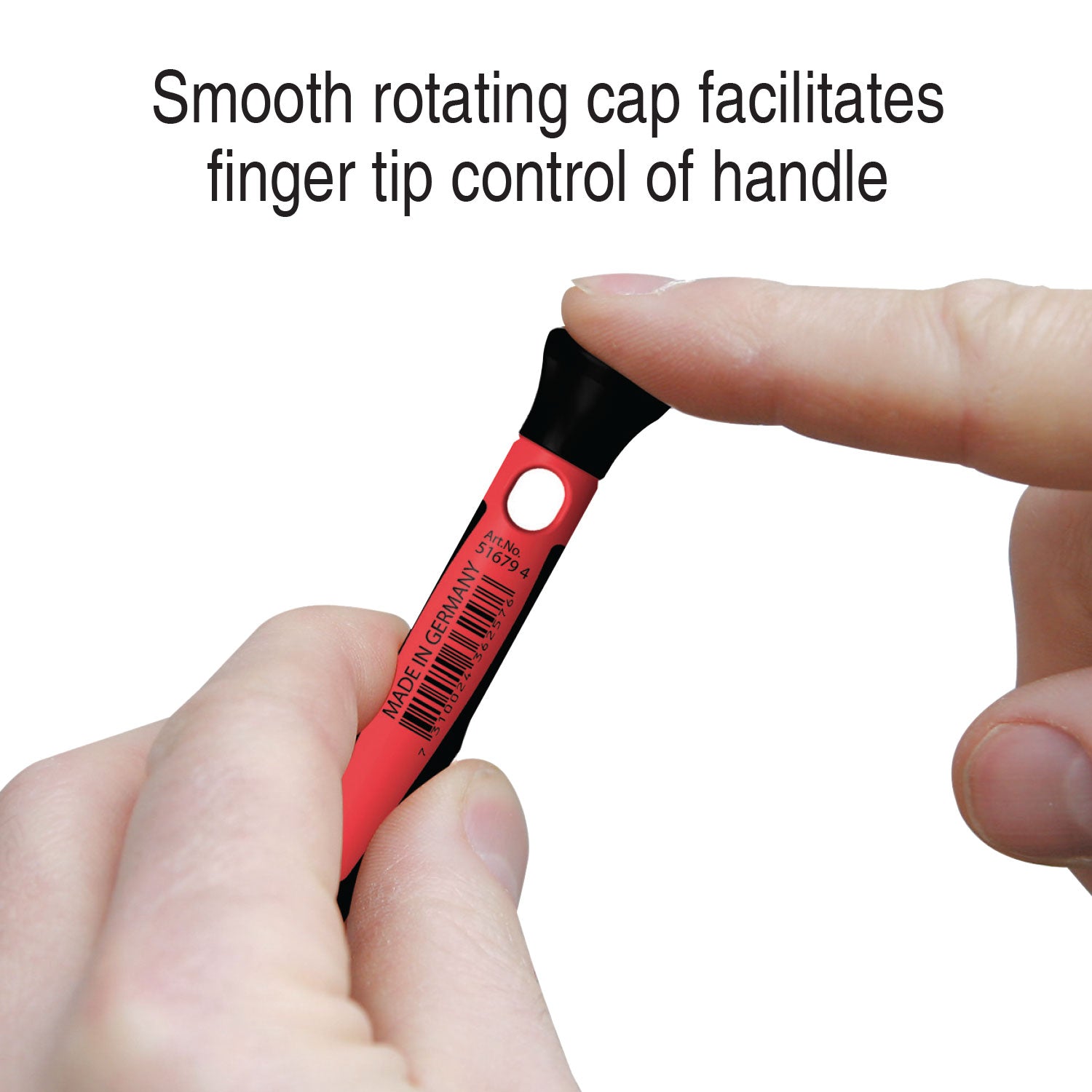 The smooth rotating cap facilitates finger tip control of the handle. The soft grip handle design provides ergonomic comfort AND superior driving force with reduced effort. Precision black tip fits screw head exactly.