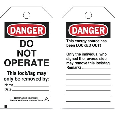 Prioritize safety and clear communication in your facility with the Brady 66051 Economy DANGER Do Not Operate Energy Source Lockout Tagout Tag. This essential safety tag is expertly crafted to warn personnel against unauthorized or accidental equipment operation, significantly reducing the risk of workplace injuries and costly downtime.