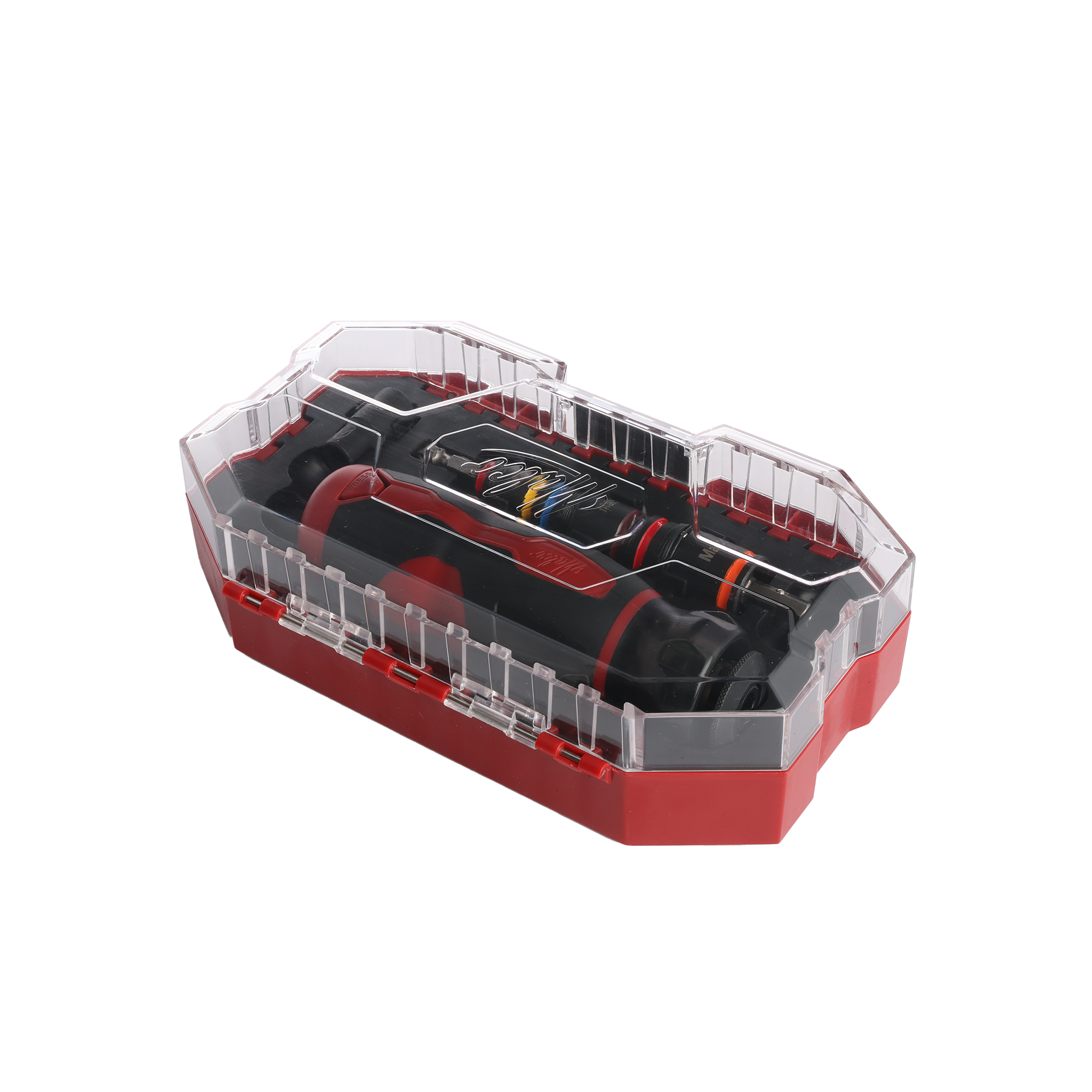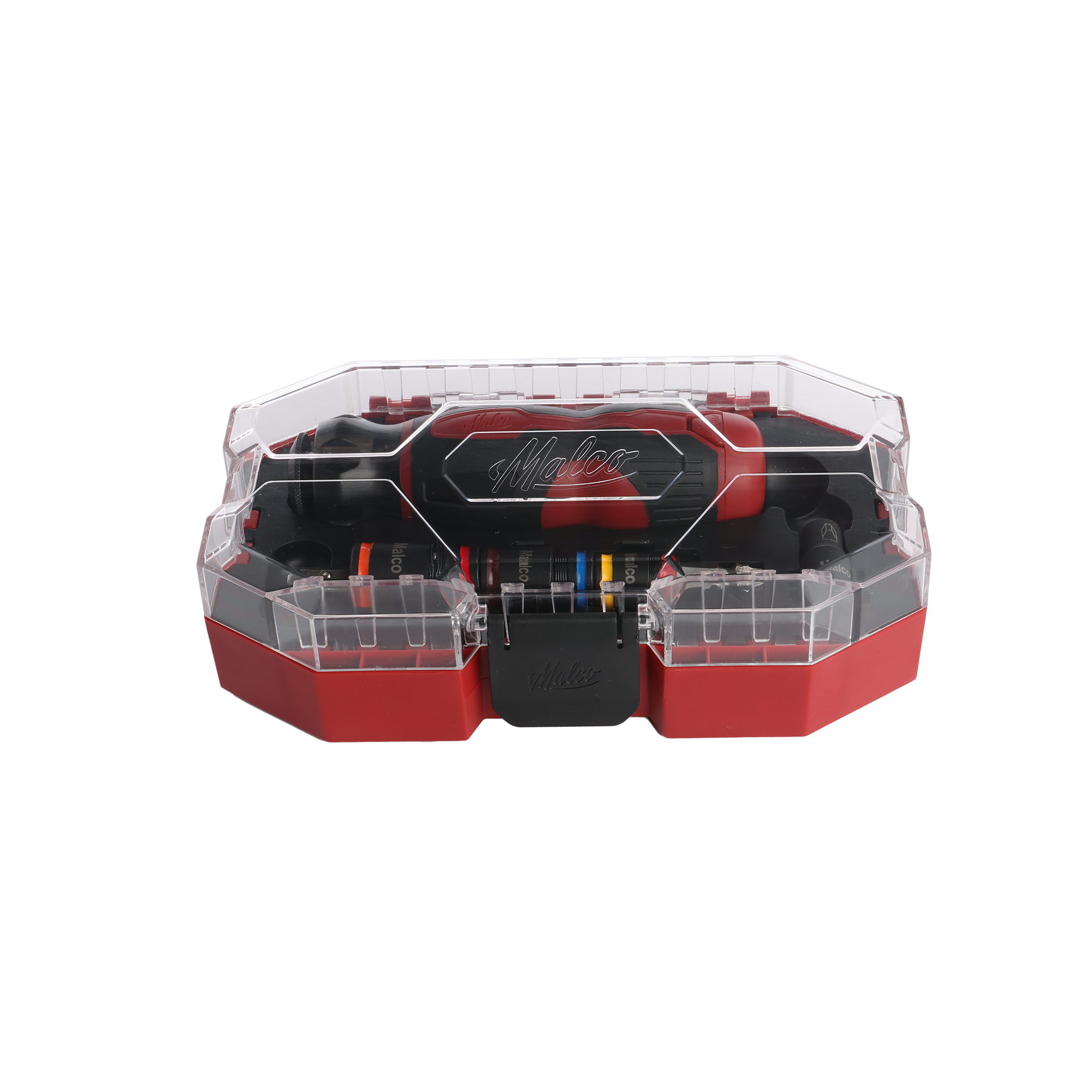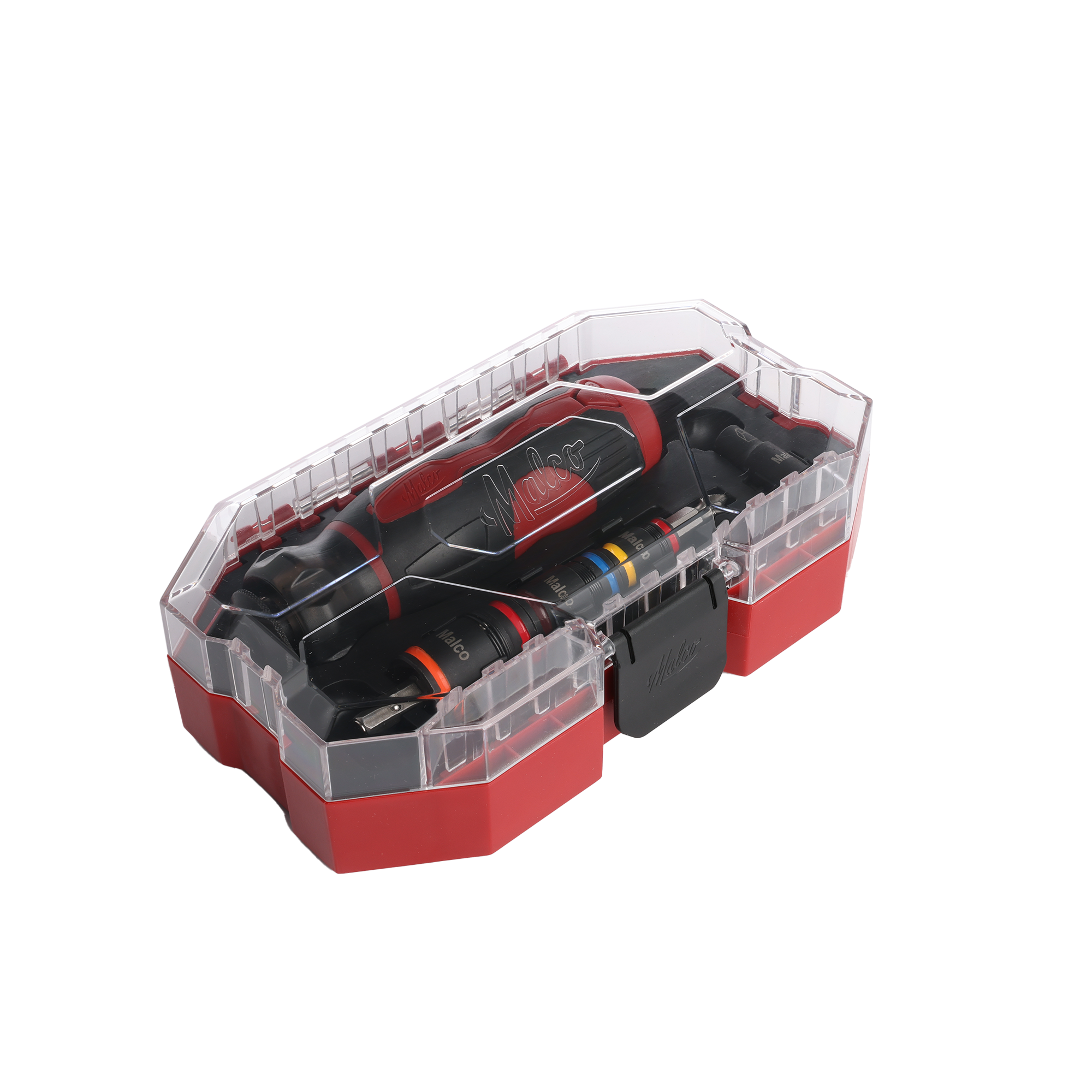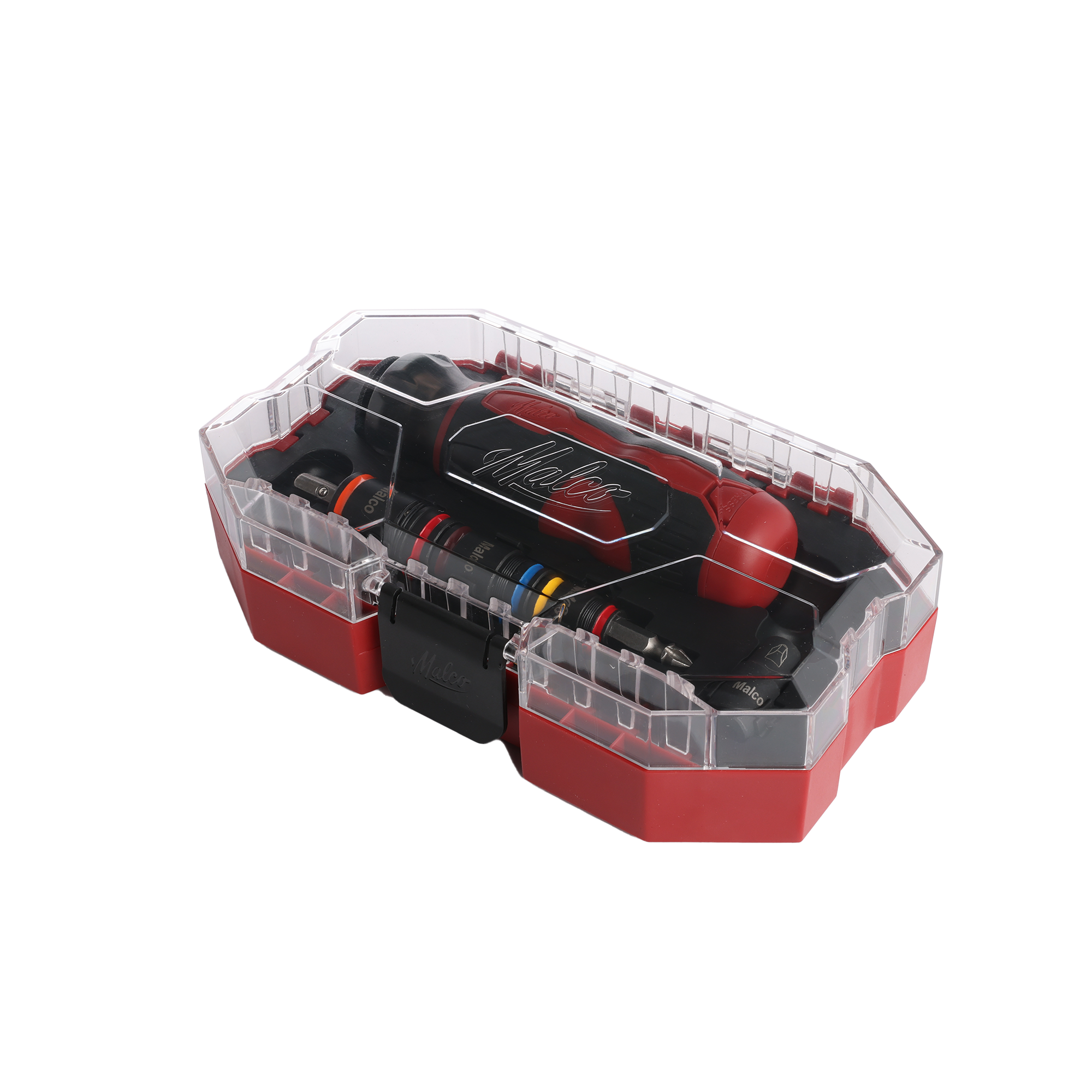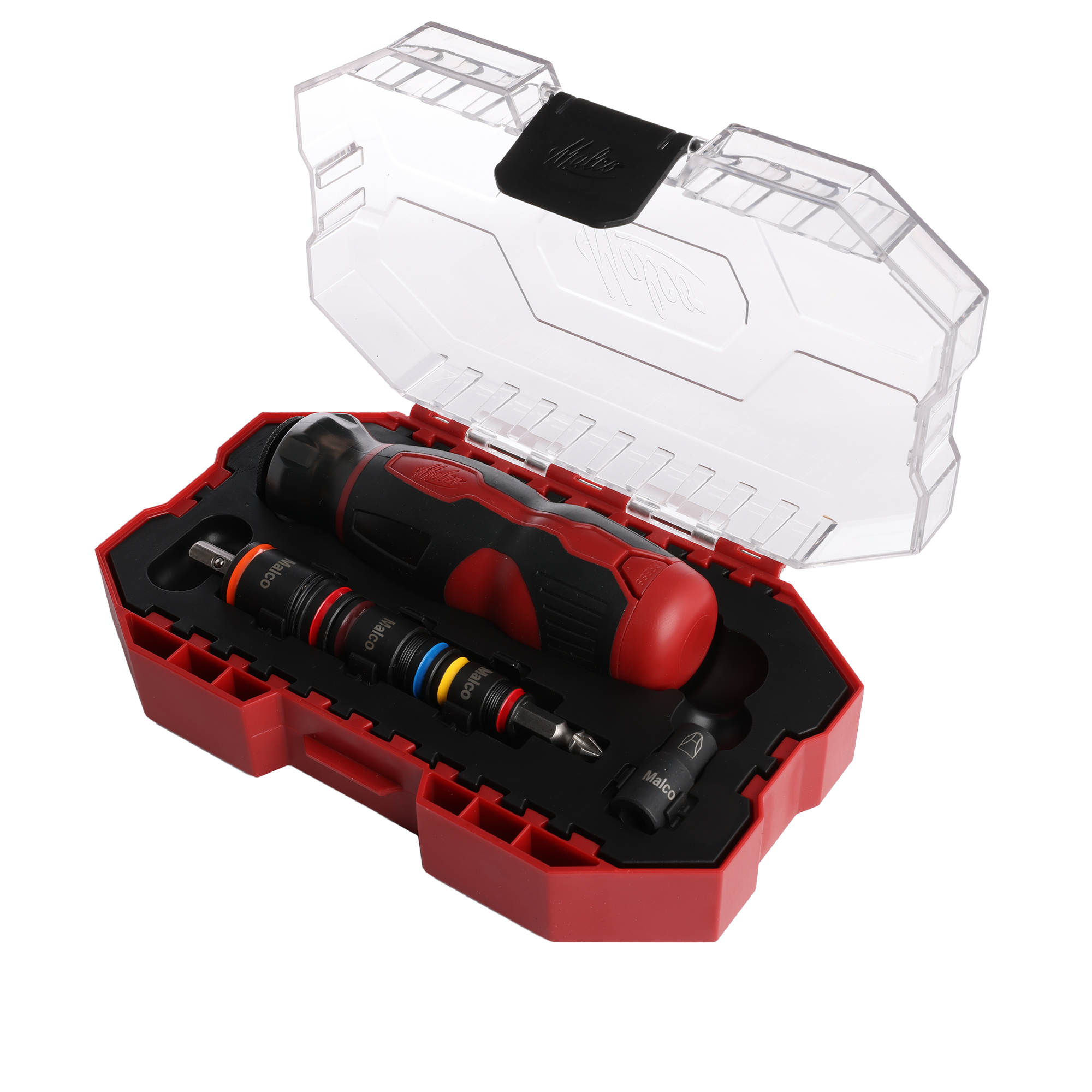 This kit features the Malco Premium Grip Handle with integrated bit storage—conveniently housing 12 included impact-rated 1" insert bits within the handle itself. This built-in storage keeps essential bits secure, accessible, and protected for fast changes on the fly. Essential sizes include: #1, (2) #2, and #3 Phillips, 3/16" and 1/4" Slotted (Flathead), T10, T15, T20, and T25 Torx and #1 and #2 Robertson (Square). Designed with an ergonomic grip, washer-style quick release and a shock-resistant core, the handle delivers enhanced comfort, control, and long-term reliability in demanding environments.