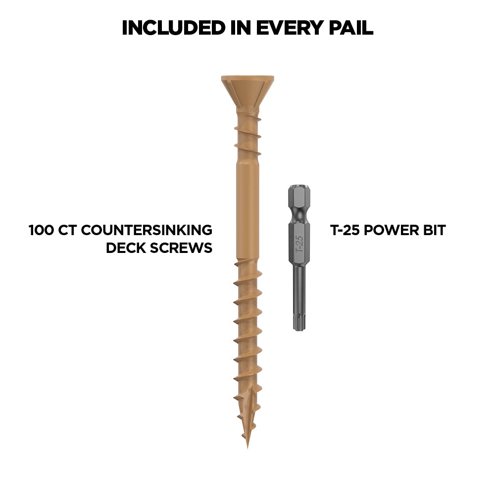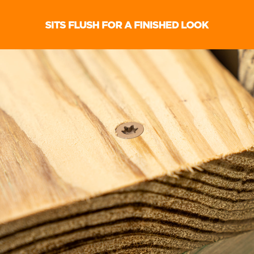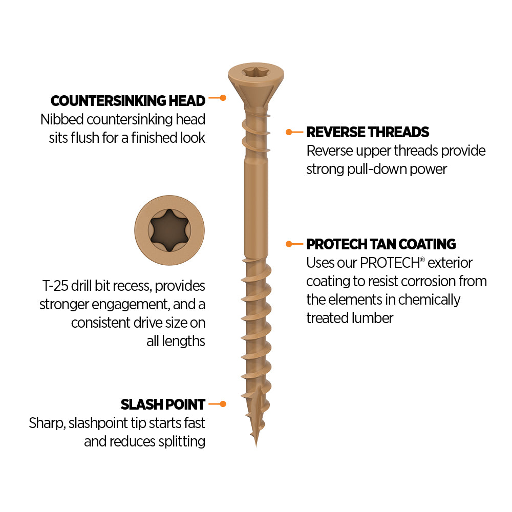 This full-featured, does-it-all decking screw from CAMO is a countersinking workhorse. Featuring reverse upper threads to hold tight, and a nibbed countersinking head design for a clean, flush finish, it is the exterior screw you’ll keep coming back to. CAMO Countersinking Deck Screws are coated in our proprietary PROTECH coating, protecting the fastener from harmful corrosion from the elements in chemically treated lumber.