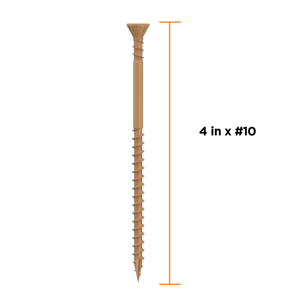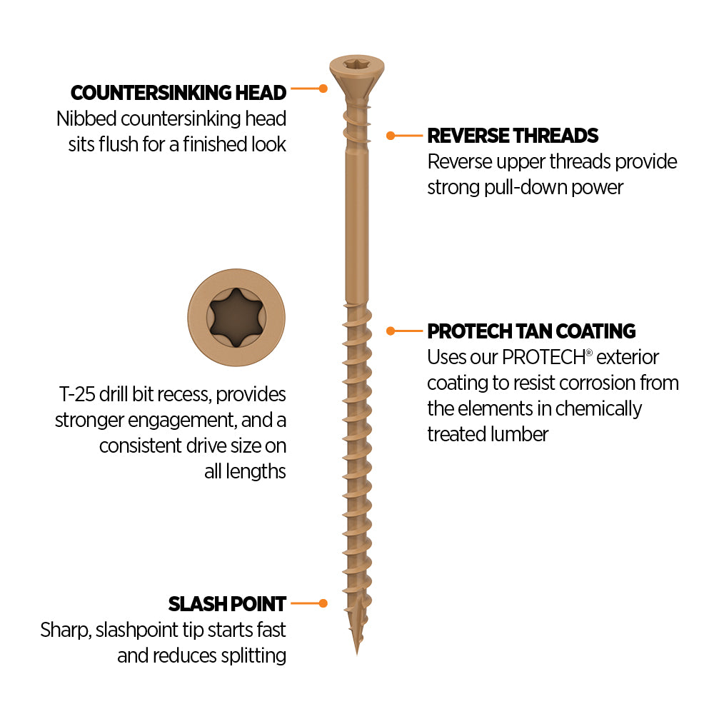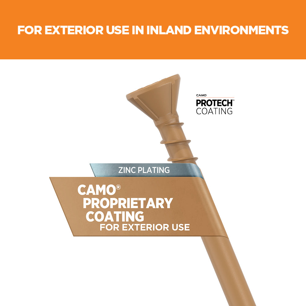This full-featured, does-it-all decking screw from CAMO is a countersinking workhorse. Featuring reverse upper threads to hold tight, and a nibbed countersinking head design for a clean, flush finish, it is the exterior screw you’ll keep coming back to. CAMO Countersinking Deck Screws are coated in our proprietary PROTECH coating, protecting the fastener from harmful corrosion from the elements in chemically treated lumber.