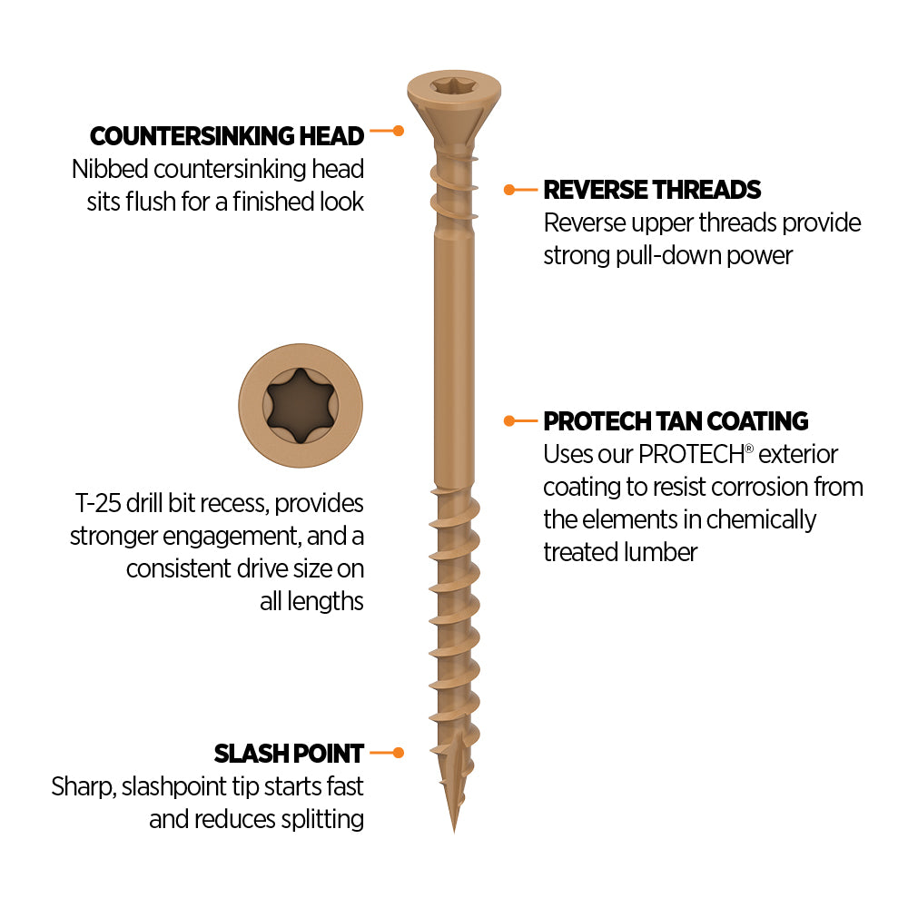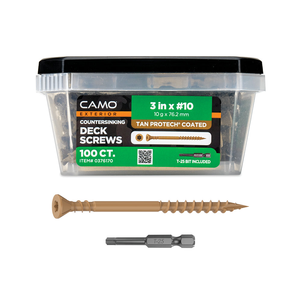 This full-featured, does-it-all decking screw from CAMO is a countersinking workhorse. Featuring reverse upper threads to hold tight, and a nibbed countersinking head design for a clean, flush finish, it is the exterior screw you’ll keep coming back to. CAMO Countersinking Deck Screws are coated in our proprietary PROTECH coating, protecting the fastener from harmful corrosion from the elements in chemically treated lumber.