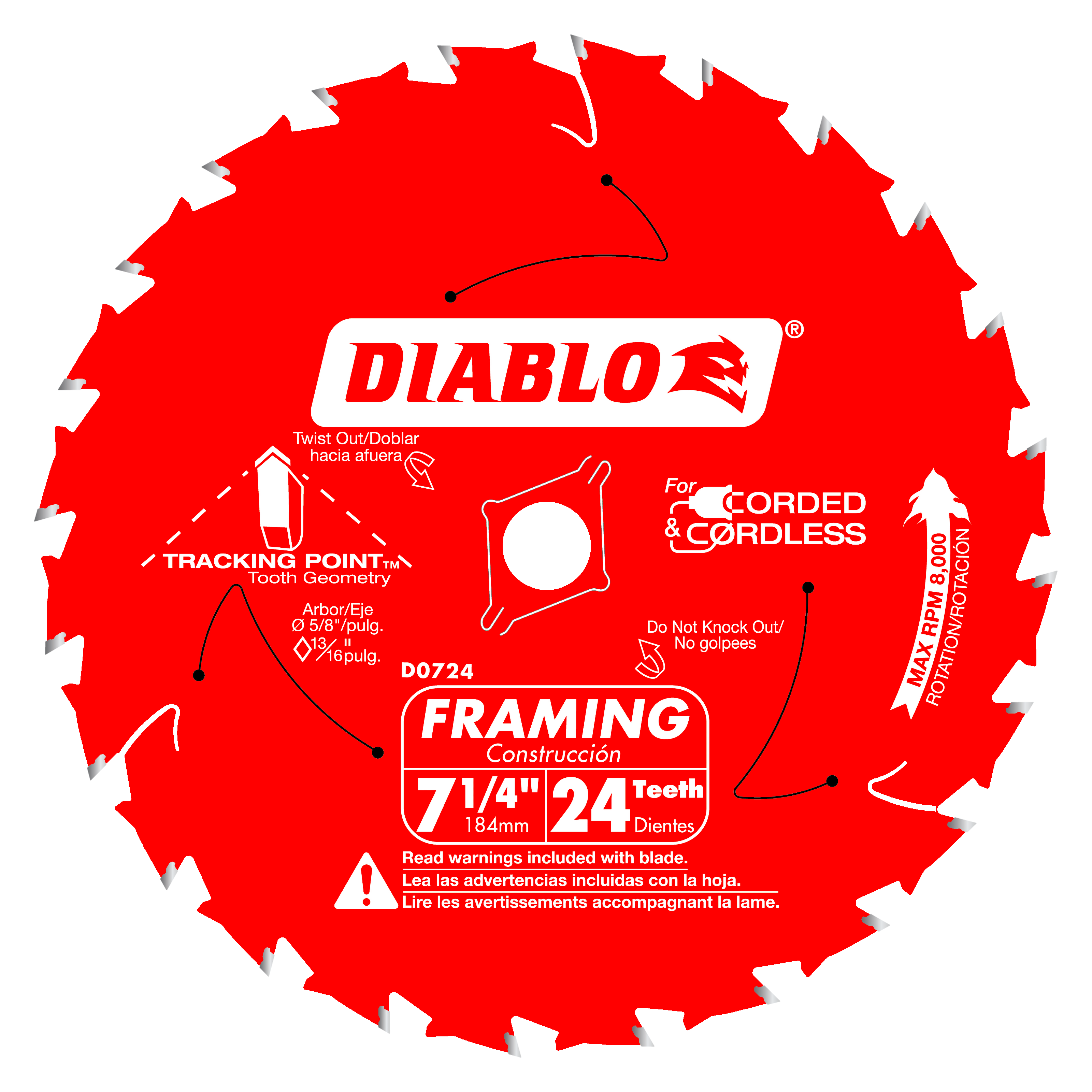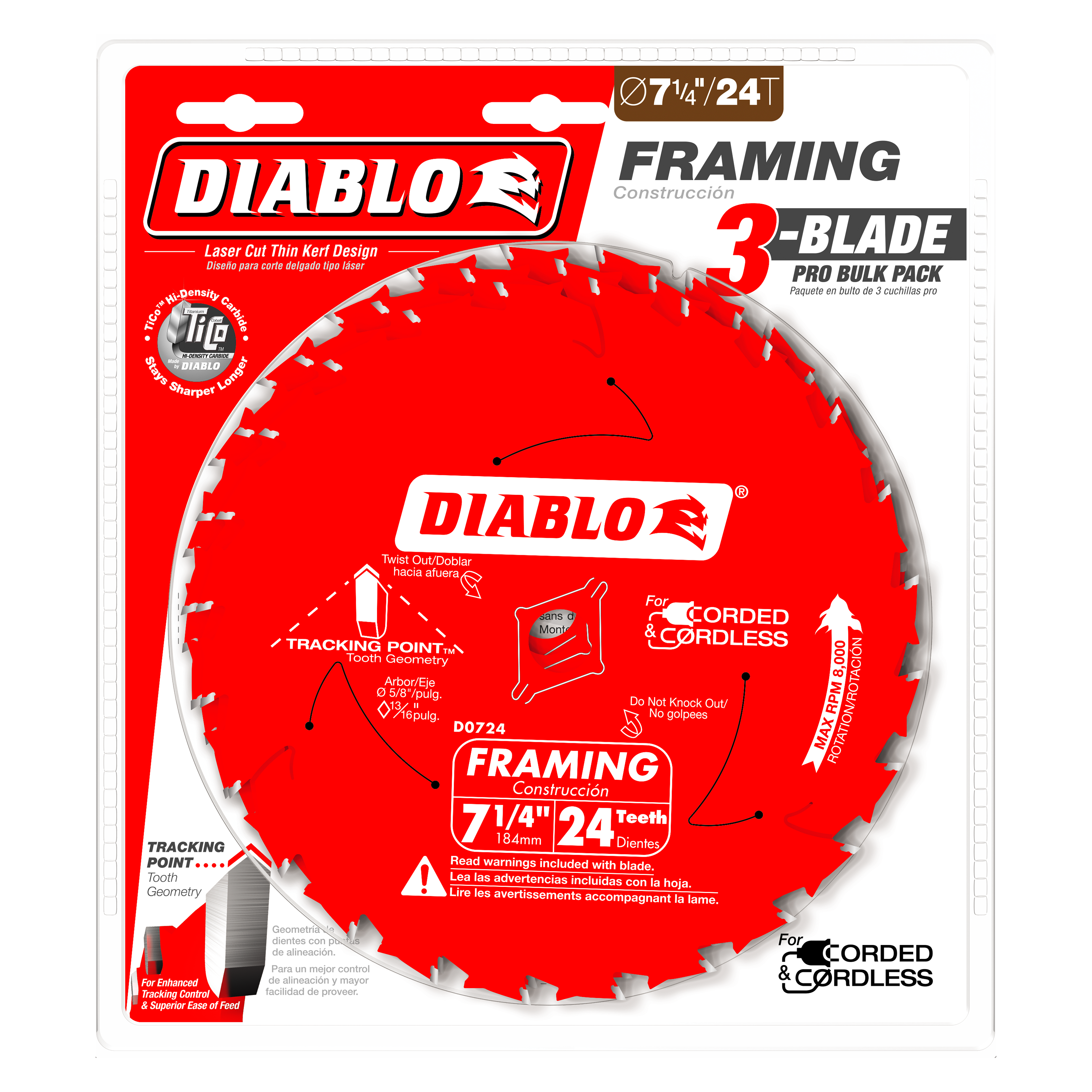 Experience unparalleled cutting precision with the Diablo D0724X3 7-1/4" x 24-Teeth Framing Saw Blades for Wood (3-Pack). Designed for both professional and DIY enthusiasts, these blades feature the revolutionary Tracking Point™ tooth design, ensuring maximum life and extraordinary durability with every cut.