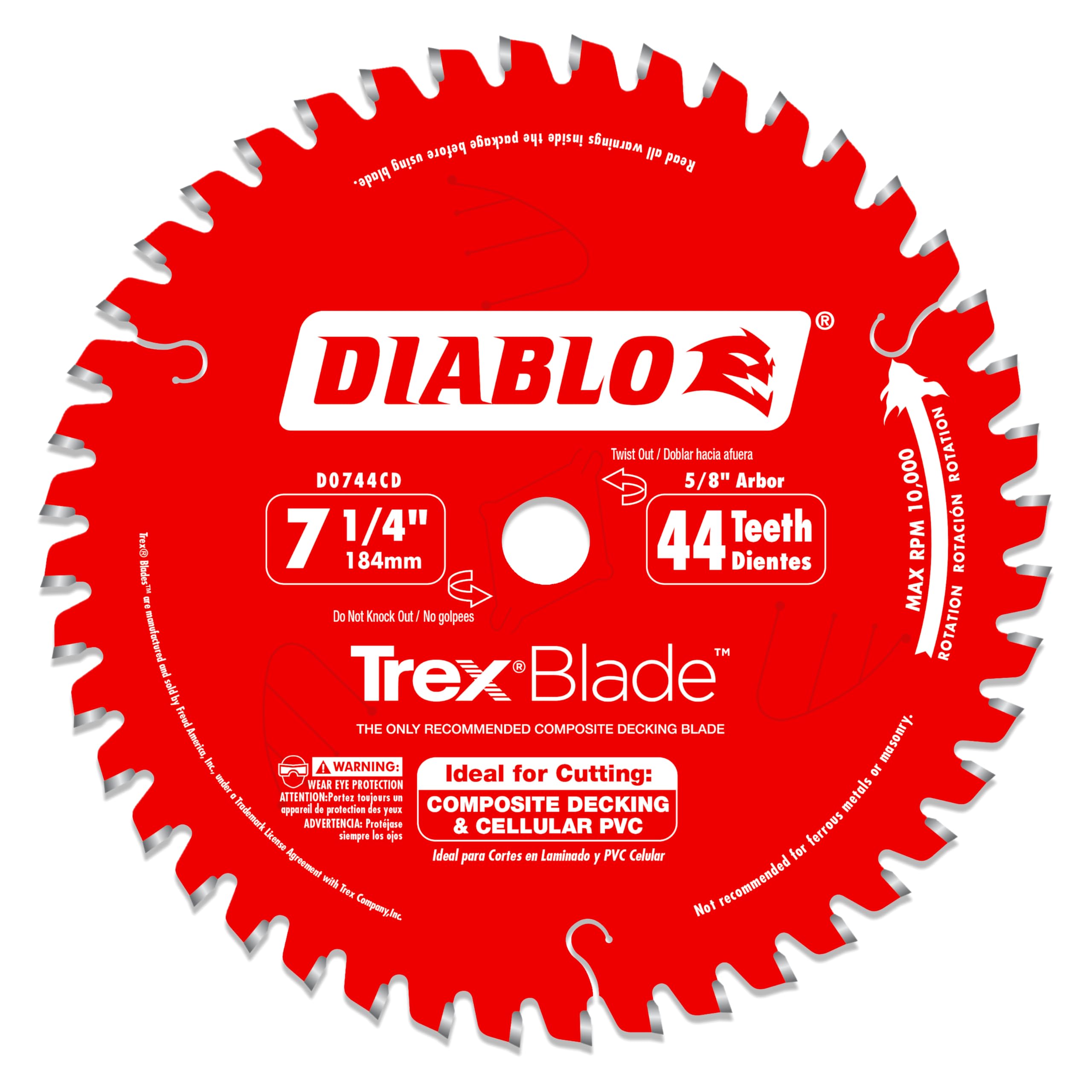 Diablo's TrexBlade™ Saw Blade for Composites and Plastic is the only blade recommended by Trex Company for cutting their composite decking materials. These new blades deliver maximum performance and highest quality of finish; making it a ‘must-have’ tool for both professionals and DIYers planning composite decking projects. Diablo's new saw blade series has a modified triple chip tooth grind design, Perma-SHIELD® non-stick coating, and specific TiCo™ Hi-Density carbide to deliver more efficient and cleaner cuts with no swirl marks, less “gumming” of blade teeth and longer cutting life .