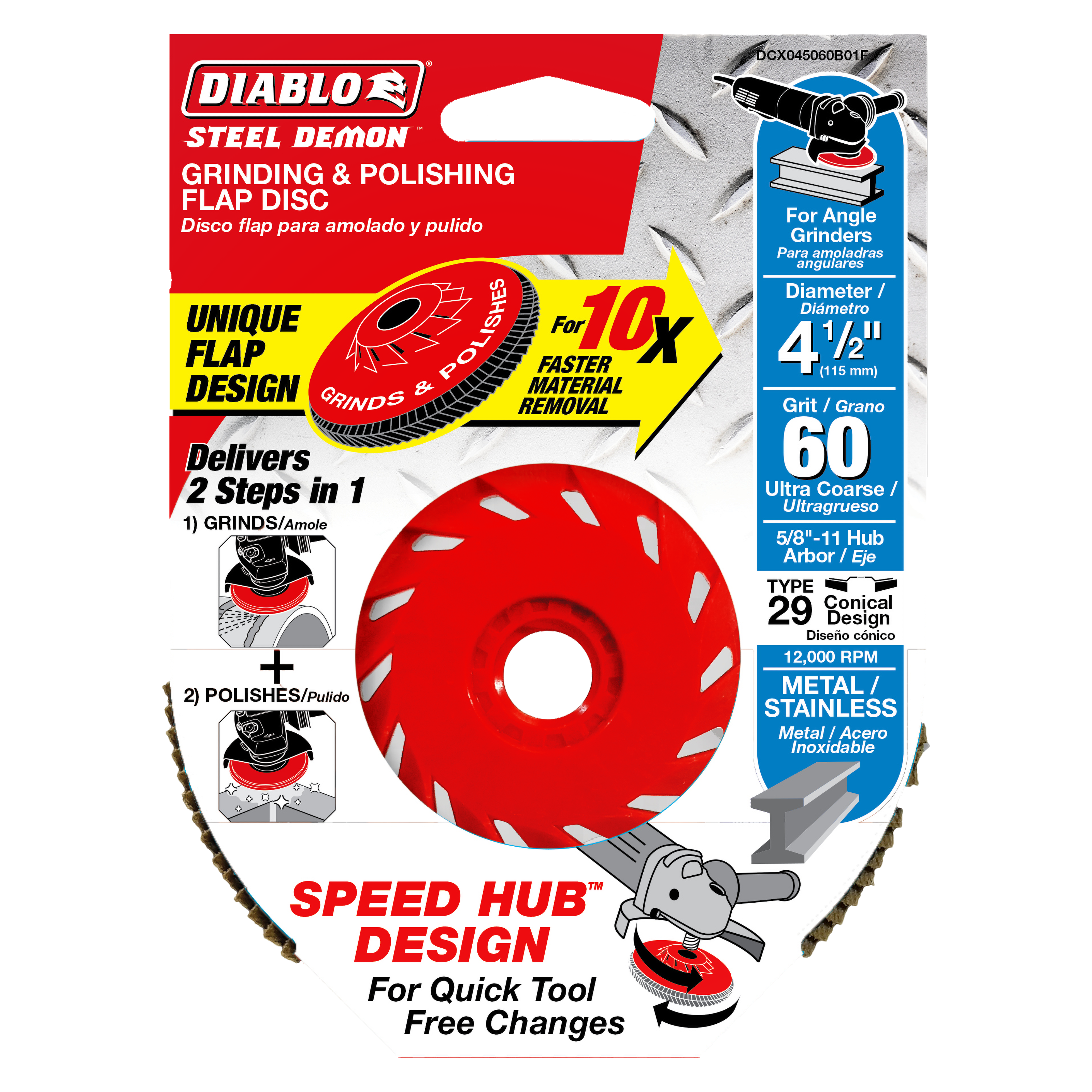 Featuring a premium zirconium grain blend, the Steel Demon™ flap disc offers exceptional durability and longevity. Experience up to 10X faster material removal compared to standard grinding wheels, making your projects more efficient and effective. The innovative flap design enhances flexibility, allowing for a cushioned grinding effect that minimizes surface damage while delivering superior results.