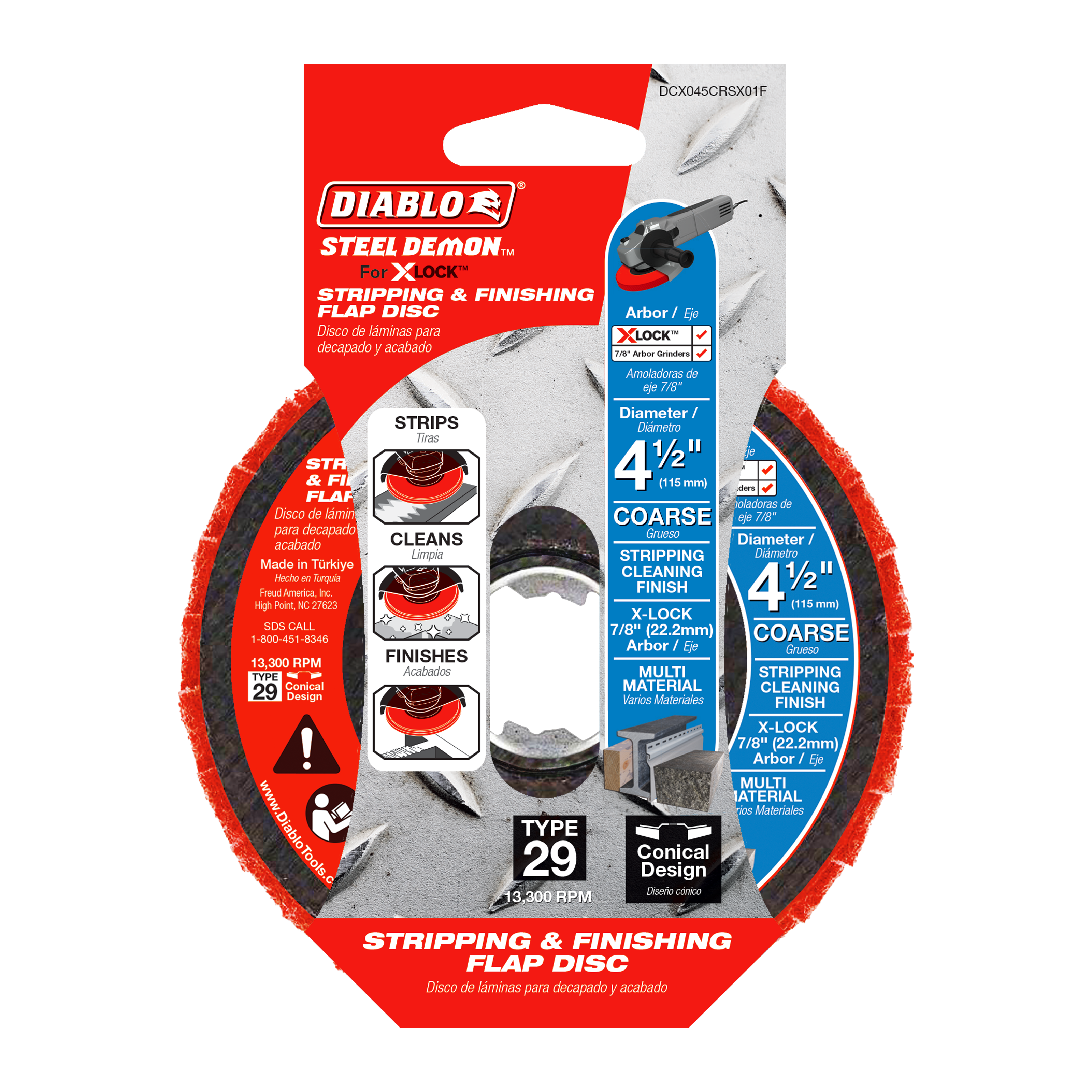 Experience unparalleled performance with the Diablo Steel Demon™ 4-1/2" Medium Grit Stripping and Finishing Flap Disc, specifically designed for X-LOCK™ and 7/8" arbor angle grinders. This innovative tool not only strips and cleans surfaces but also finishes them to perfection in a single step, ensuring efficiency and high-quality results.