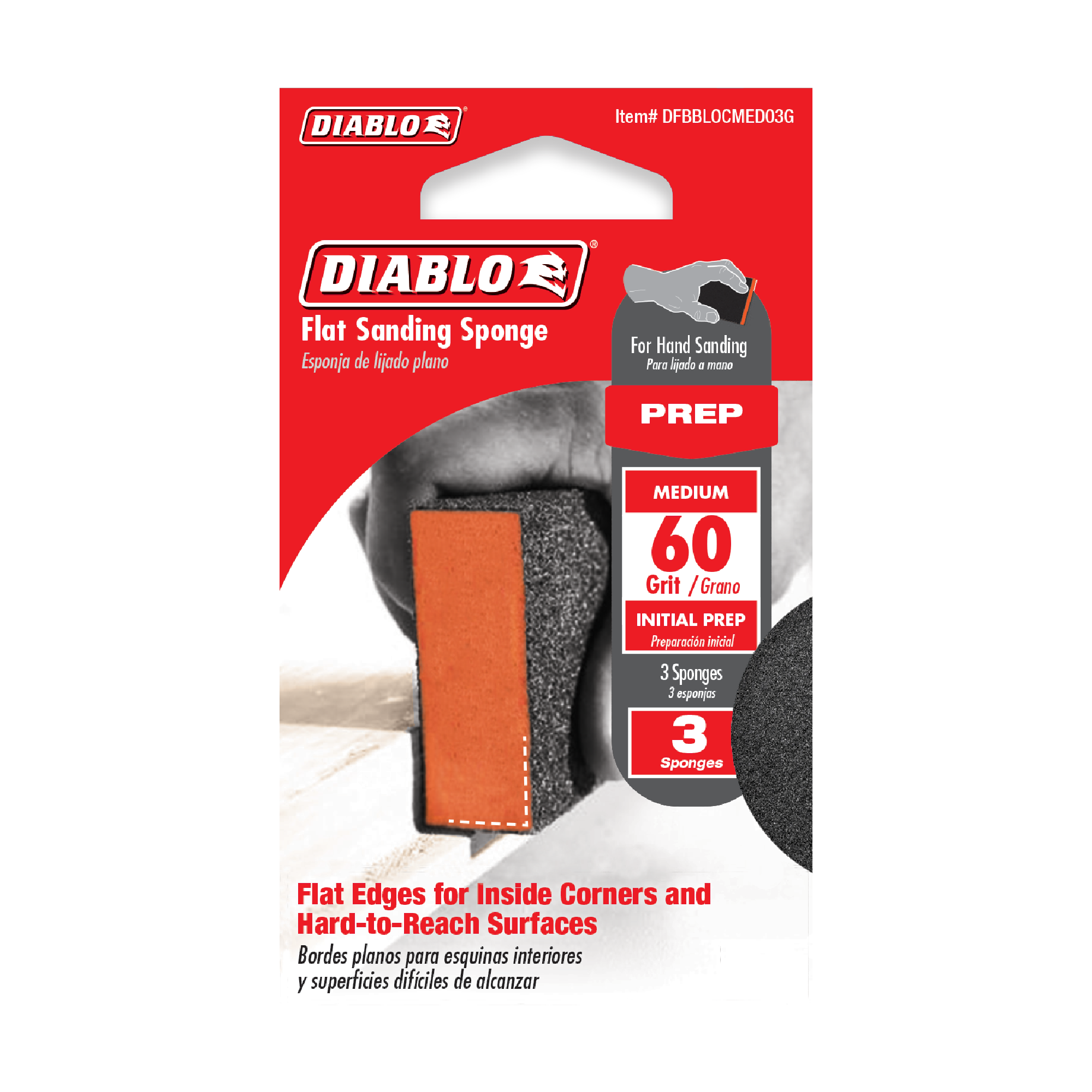 Experience unmatched efficiency and precision with the Diablo DFBBLOCMED03G 4" x 2-1/2" x 1" 60-Grit Flat Edge Sanding Sponges (3-Piece). These sanding sponges are expertly engineered to deliver consistent, smooth finishes on a variety of surfaces, making them an essential tool for both professional craftsmen and DIY enthusiasts.