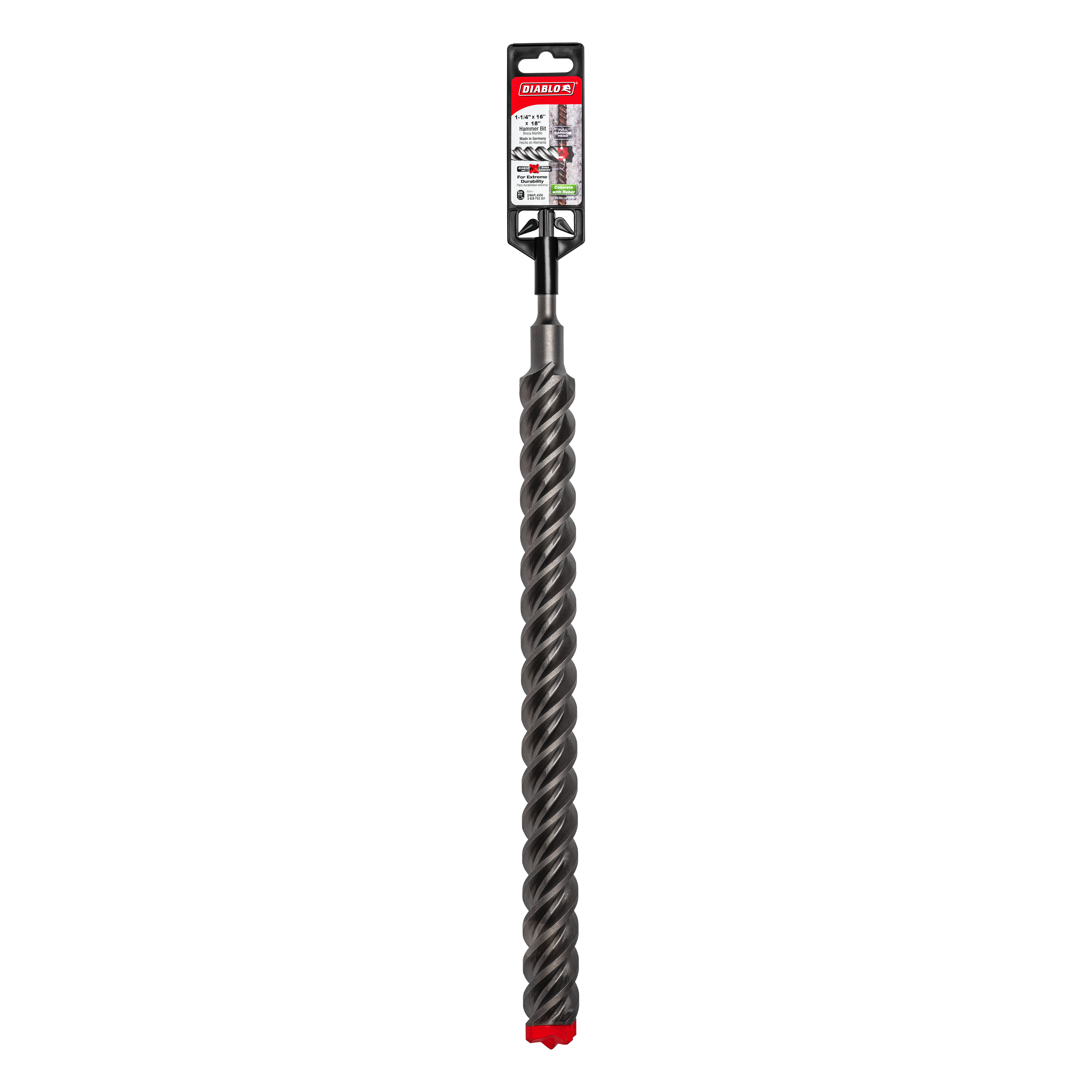 Introducing the Diablo DMAPL4330 1-1/4" x 16" x 18" Rebar Demon™ SDS-Plus Hammer Drill Bit, a game-changer in the world of drilling. Designed to tackle the toughest challenges, this hammer drill bit combines cutting-edge technology with unparalleled durability. Perfect for professionals and DIY enthusiasts alike, the Rebar Demon™ features a full carbide head that ensures extended longevity and superior performance.