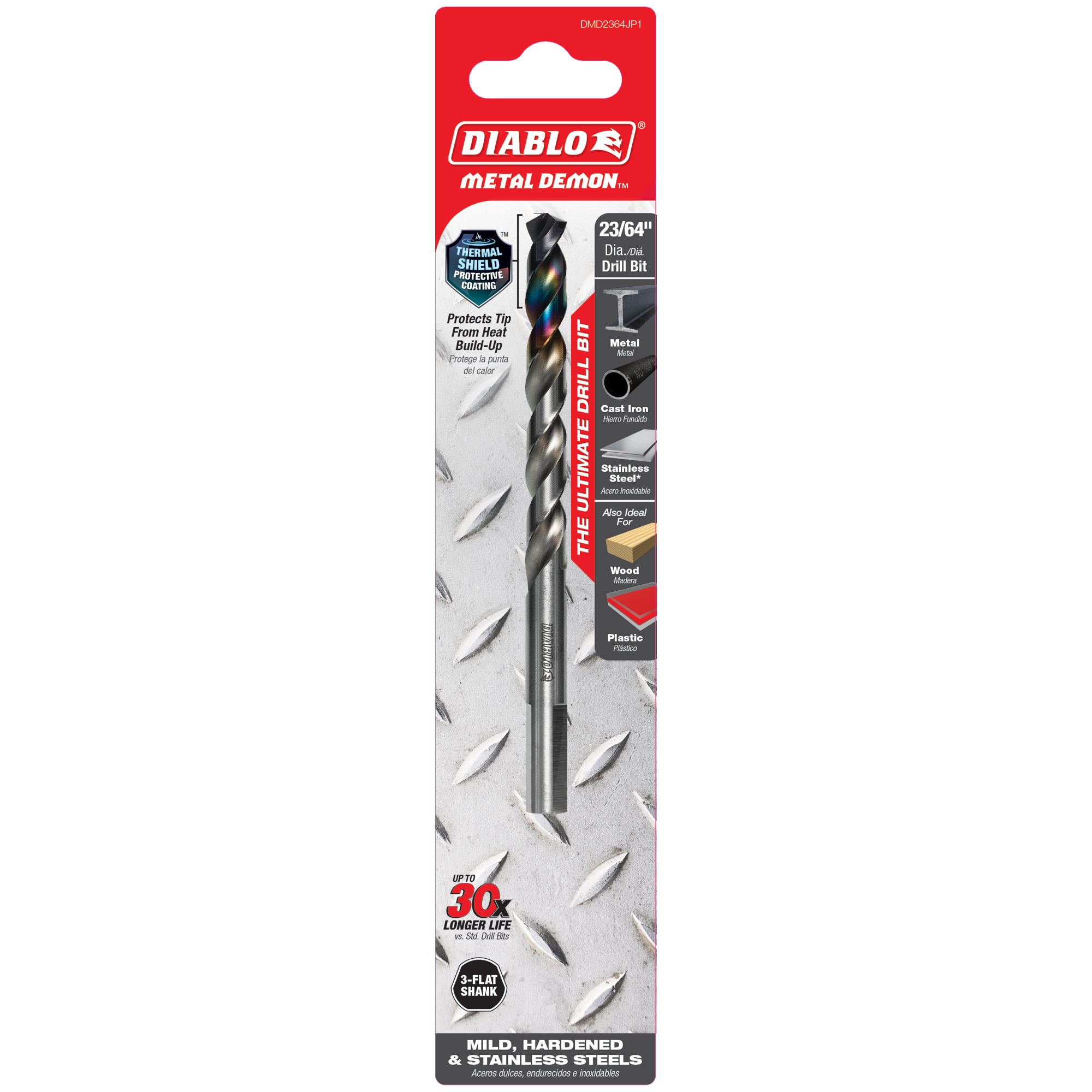 Introducing the Diablo DMD2364JP1 23/64" Metal Demon™ Drill Bit, the ultimate solution for all your metal drilling needs. This innovative drill bit is engineered to tackle a variety of materials, including mild, hardened, and stainless steels, making it a must-have for both professionals and DIY enthusiasts.