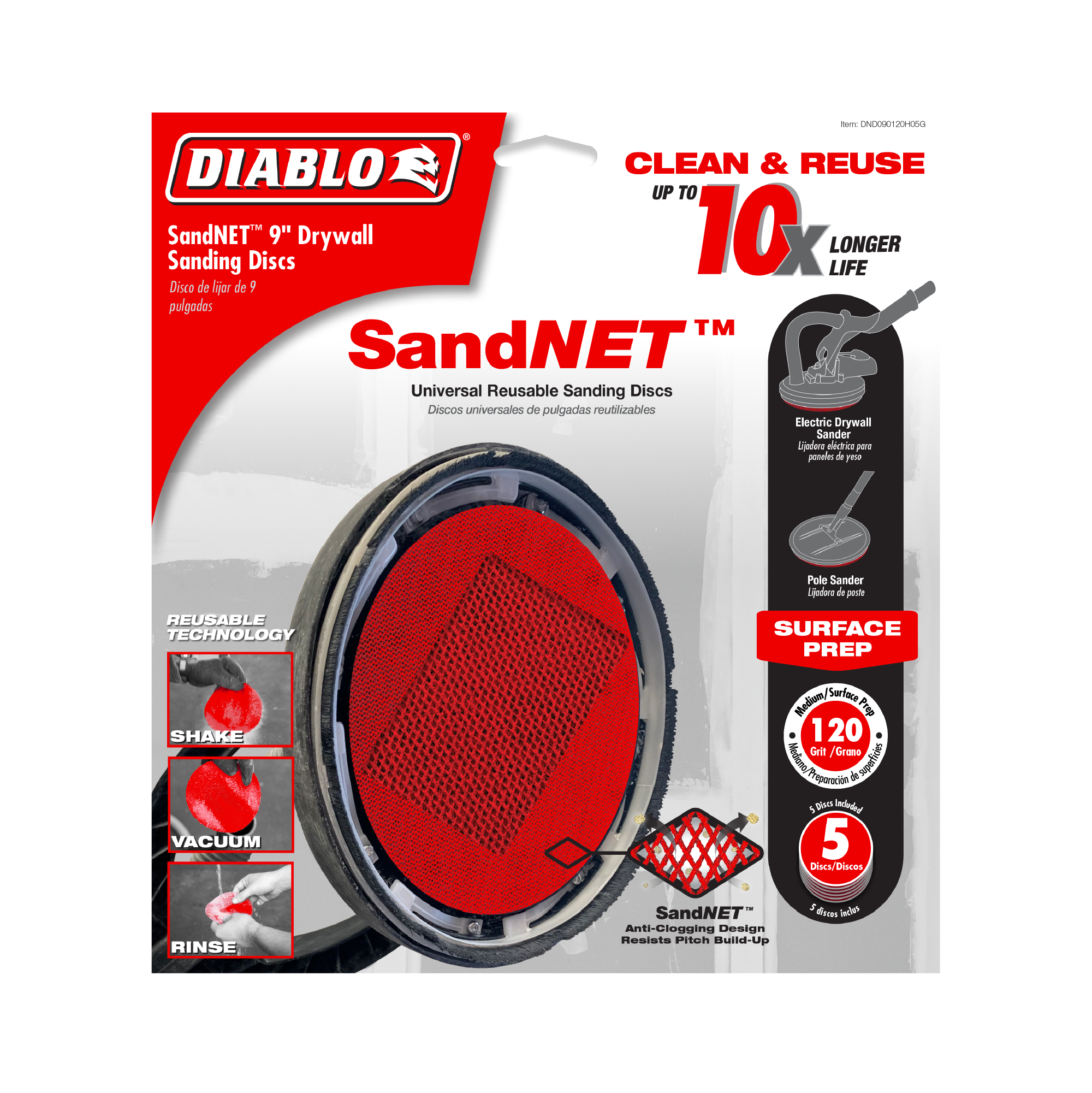 Experience the ultimate in sanding efficiency with the Diablo DND090120H05G 9" 120-Grit SandNET™ Sanding Discs for Drywall. This 5-pack of advanced sanding discs is designed to elevate your drywall finishing tasks, providing a professional-grade finish with unmatched durability.