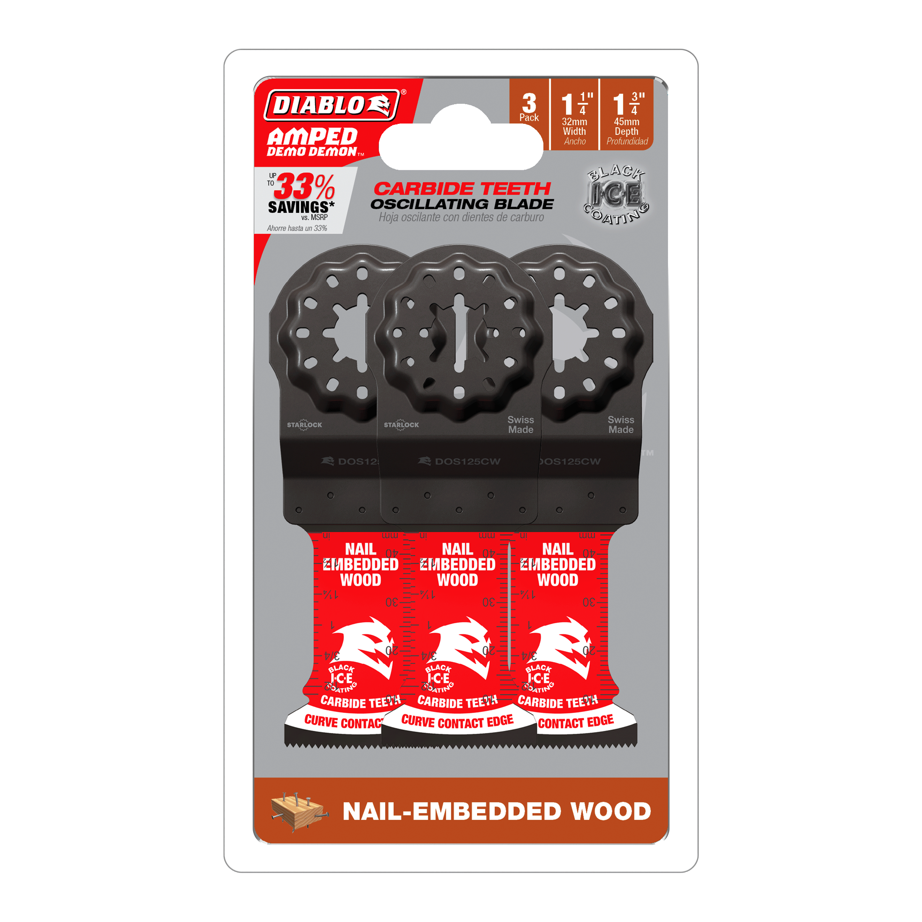 Diablo DOS125CW3 1-1/4" Diablo AMPED™ Demo Demon™ Starlock Carbide Teeth Oscillating Blades for Nail-Embedded Wood (3-Pack)