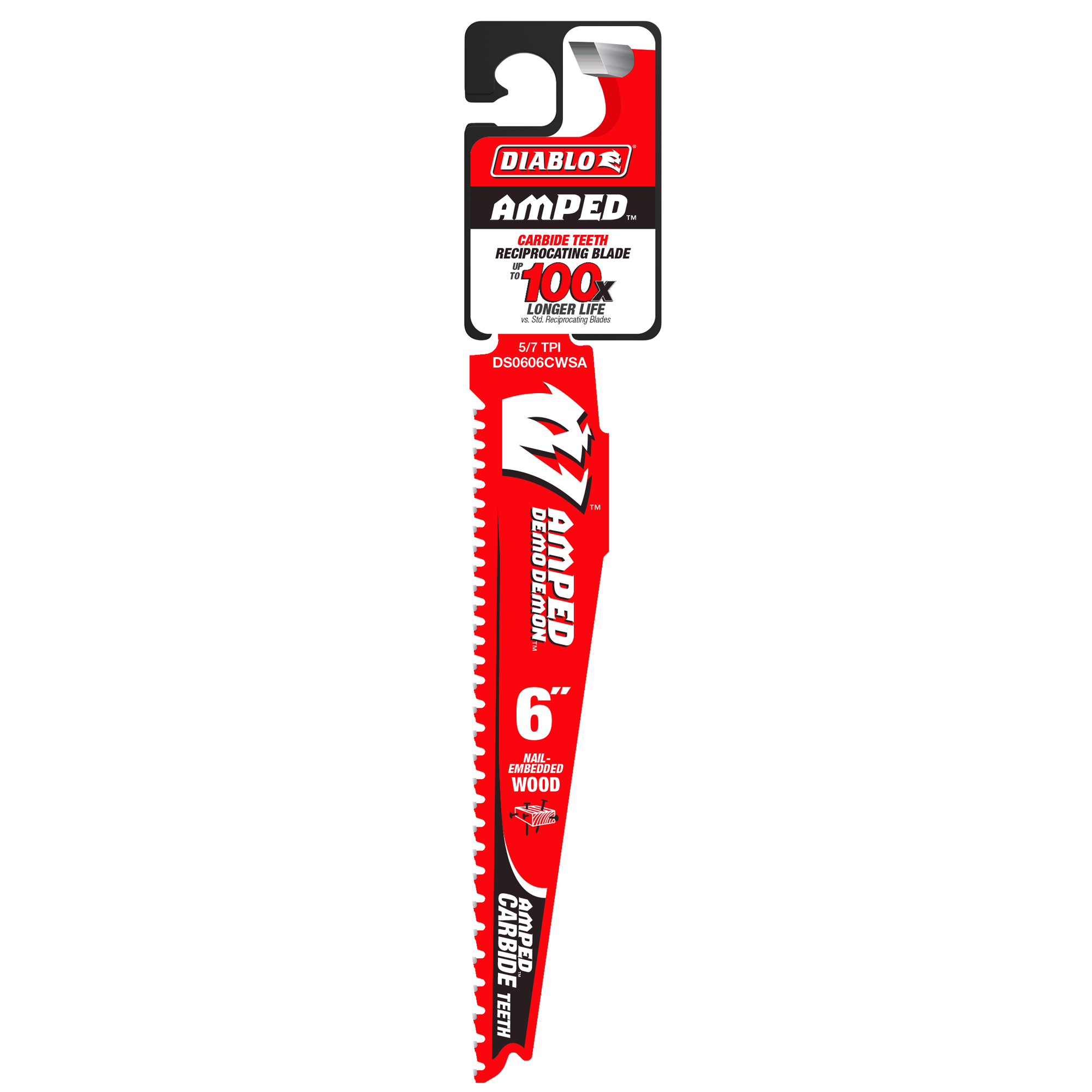 Introducing the Diablo DS0606CWSA 6" 5/7 TPI AMPED™ Demo Demon™ Carbide Teeth Reciprocating Saw Blade, your ultimate solution for tackling nail-embedded wood with unparalleled efficiency. Designed with cutting-edge technology, this saw blade is engineered to withstand the toughest demolition tasks.