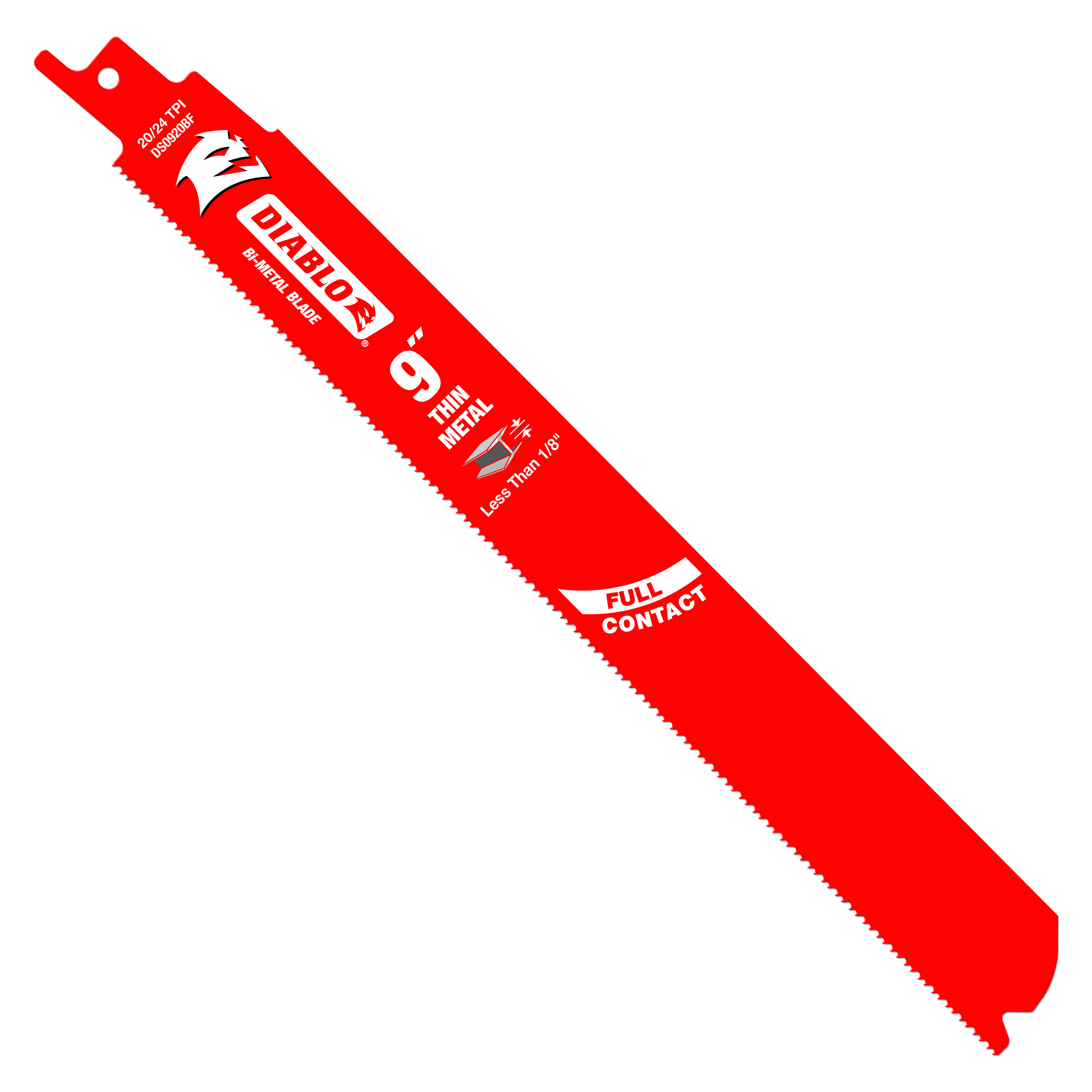 Experience unmatched cutting precision with the Diablo DS0920BF 9" 20/24TPI Bi-Metal Reciprocating Saw Blade, specially crafted for thin metal applications. Engineered to effortlessly slice through metal up to 1/8" thick, this blade combines advanced bi-metal construction with an optimized tooth design to deliver superior durability and clean cuts every time.