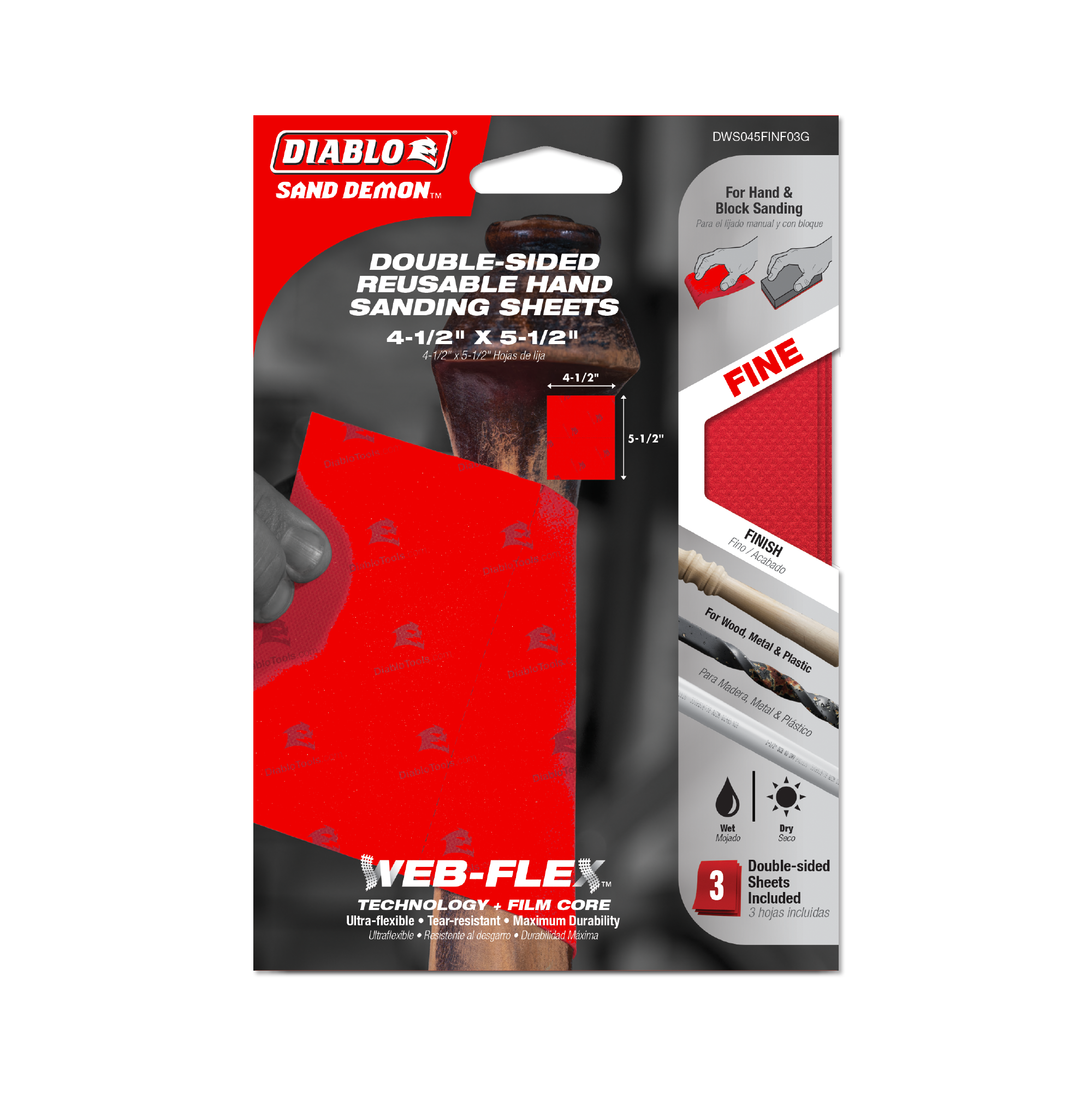 Key benefits include: enhanced durability, double-sided fine grit for extended use, comfortable hand grip for precise control, and clog-resistant design for consistent performance. Whether you're refinishing wood, metal, or drywall, the Diablo Sand Demon™ sanding sheets deliver professional-grade results every time.