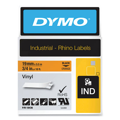 DYMO 18436 Industrial Rhino Vinyl Label Cartridge, 3/4 in W x 18 ft L, Black Print on Orange Background