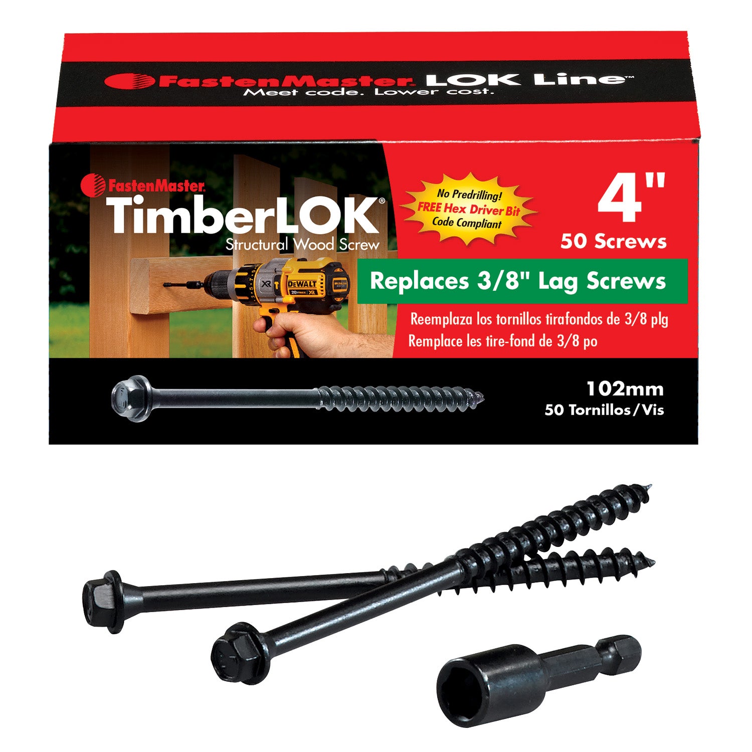 Save time, money, and labor costs. TimberLOK's sharp point and aggressive threads penetrate the densest woods without predrilling and provide stronger shear values than 3/8 inch galvanized lag screws. TimberLOK's unique countersinking head design is perfect for your next wood-to-wood project, whether it be deck framing, fencing, or any post to beam connections. It’s also perfect for replacing galvanized spikes in raised flower beds, landscaping, or retaining walls. No need to predrill and sledge a spike. TimberLOK just zips right in. Each pack size contains a free 5/6 inch driver bit. TimberLOK fasteners are American made.