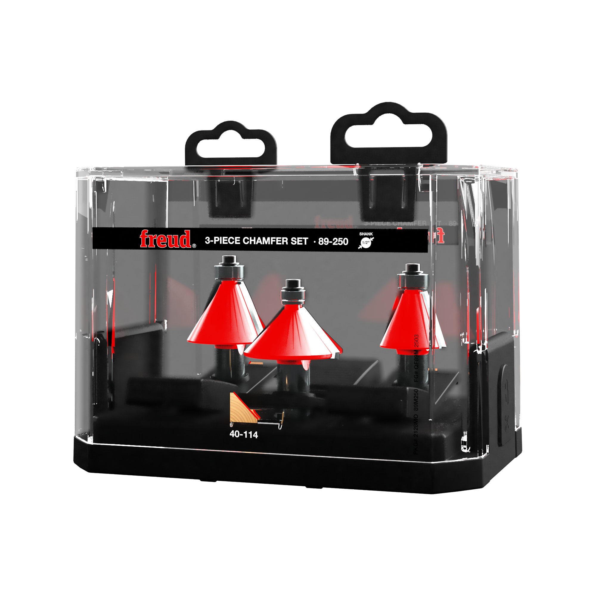 Whether you're a professional woodworker or a DIY enthusiast, the Freud 89-250 3 Piece Chamfer Bit Set is an invaluable addition to your toolkit, elevating your craftsmanship and achieving stunning results on every project.