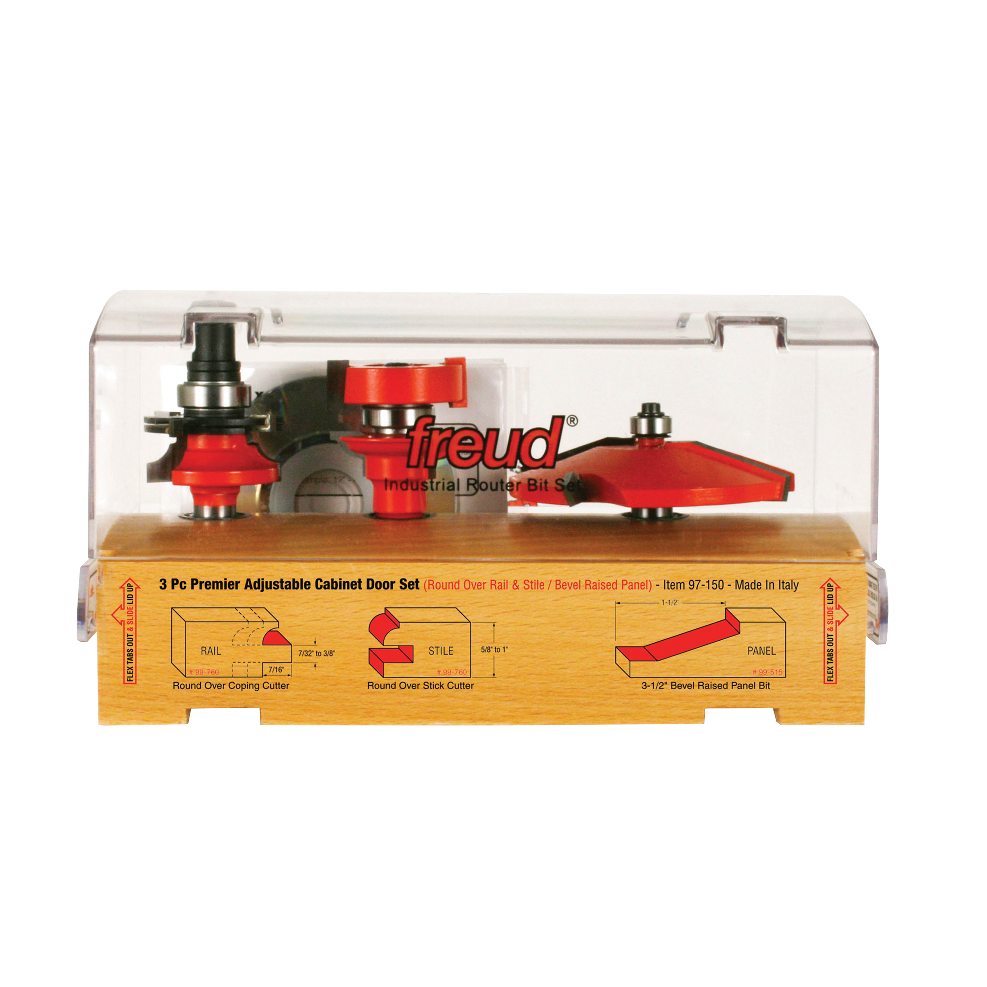 Upgrade your woodworking projects with the Freud 97-150 3 Piece Quadra-Cut Premier Adjustable Cabinet Bit Set. This exceptional set is designed specifically for those who aspire to craft stunning raised panel or flat panel doors with precision and ease.