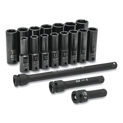 GEARWRENCH 89096 Impact Socket Set, 1/2 in Dr, 6-point, Metric, 10 mm to 24 mm, 18-Pc Deep Length, Incl Blow Mold Case