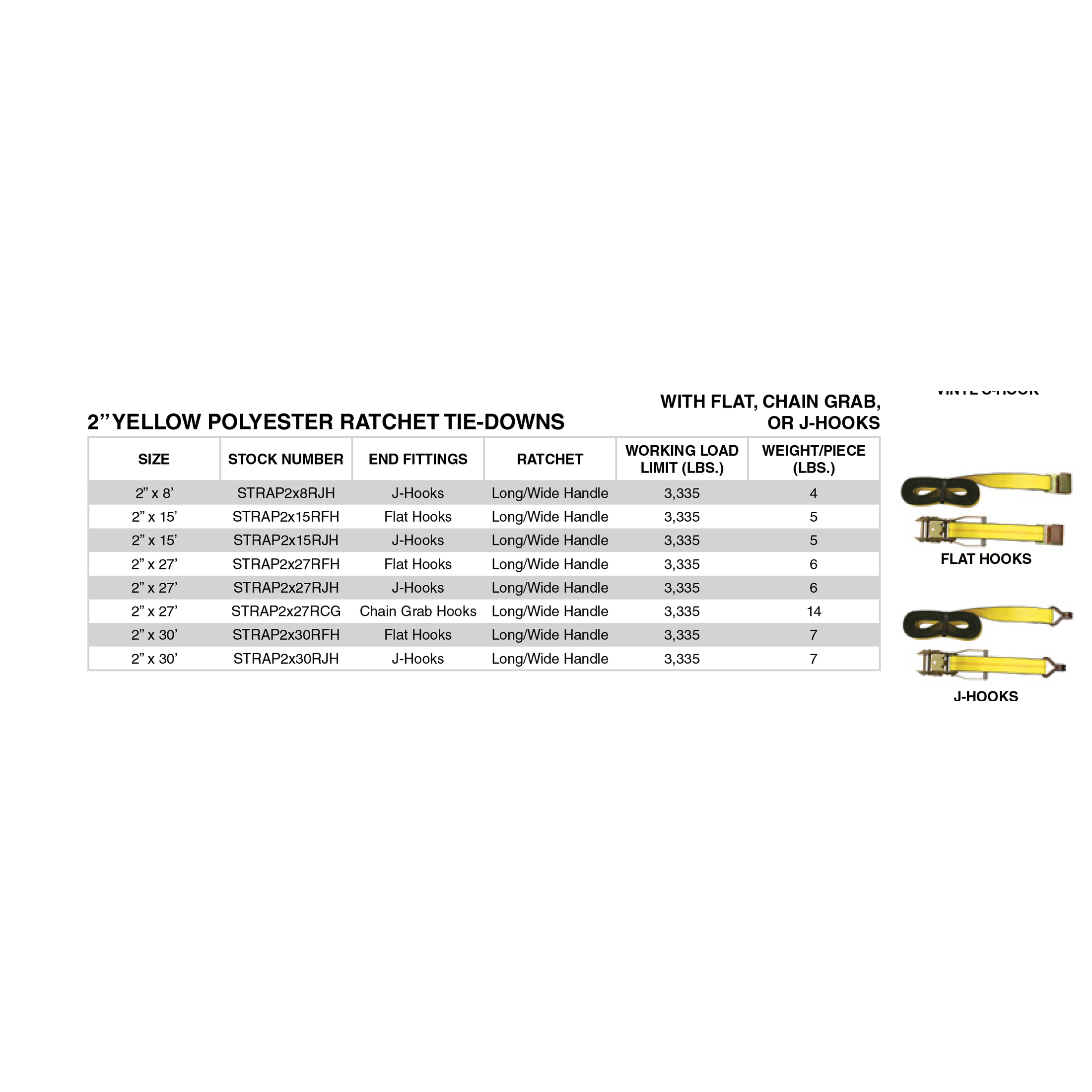 Introducing the Gold-Tip STRAP2x15RFHI 2” YELLOW POLYESTER RATCHET TIE-DOWNS WITH FLAT, CHAIN GRAB, OR J-HOOKS - the ultimate solution for all your heavy-duty securing needs. Crafted from high-quality yellow polyester, these ratchet tie-downs are designed to provide maximum strength and durability, ensuring your cargo stays secure during transport.