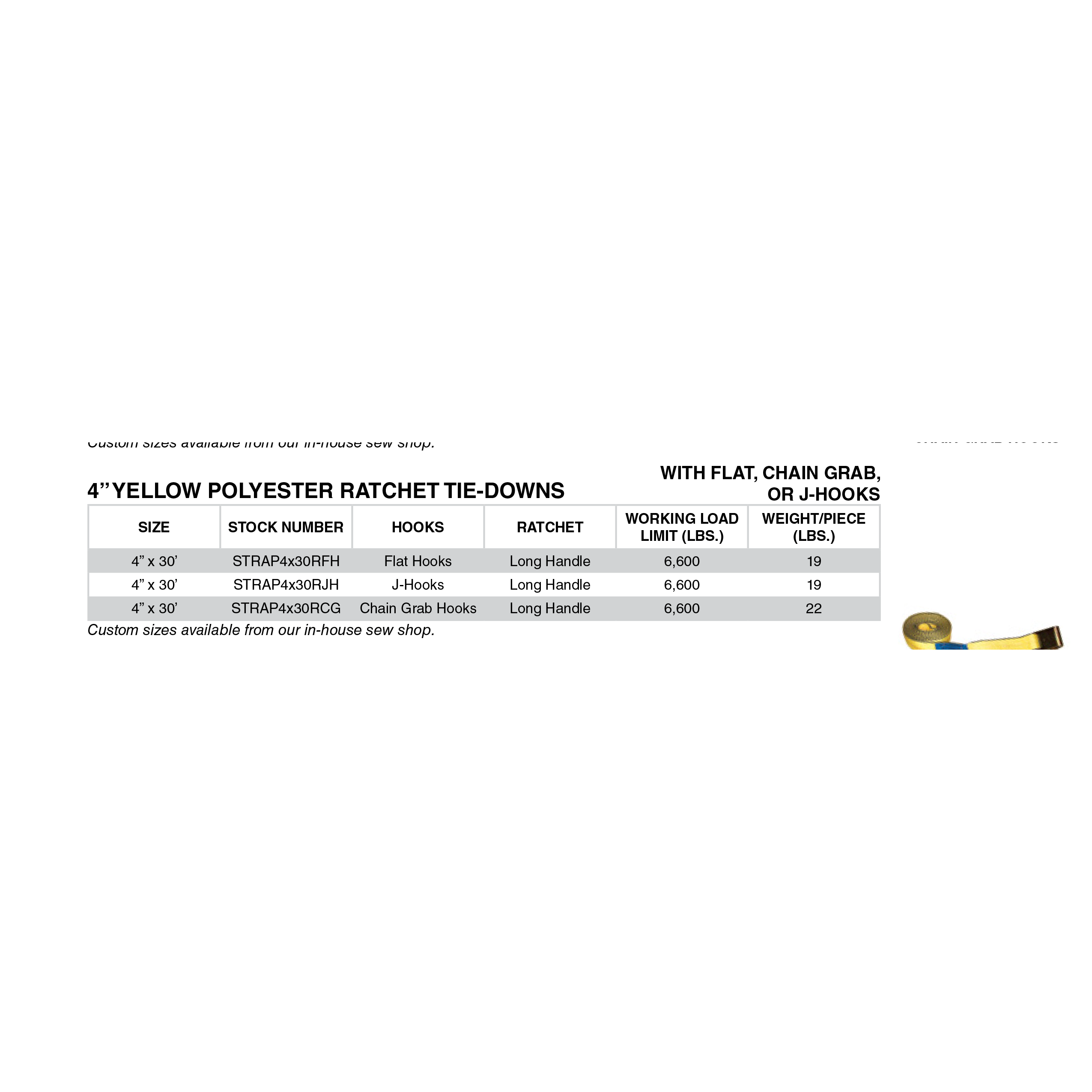 The Gold-Tip STRAP4X30RCGI 4” YELLOW POLYESTER RATCHET TIE-DOWNS WITH FLAT, CHAIN GRAB, OR J-HOOKS are designed to provide robust and reliable securing solutions for various hauling needs. Crafted from high-quality yellow polyester, these ratchet tie-downs are not only durable but also highly visible, ensuring safety during transport. With a impressive maximum break strength (MBS) of 15,000 lbs, they are perfect for securing heavy loads with confidence.