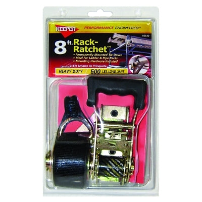 Keeper 5530 Rack-Ratchet Tie-Downs, Double-J Hooks, 1 1/2 in W, 8 ft L, 500 lb Capacity