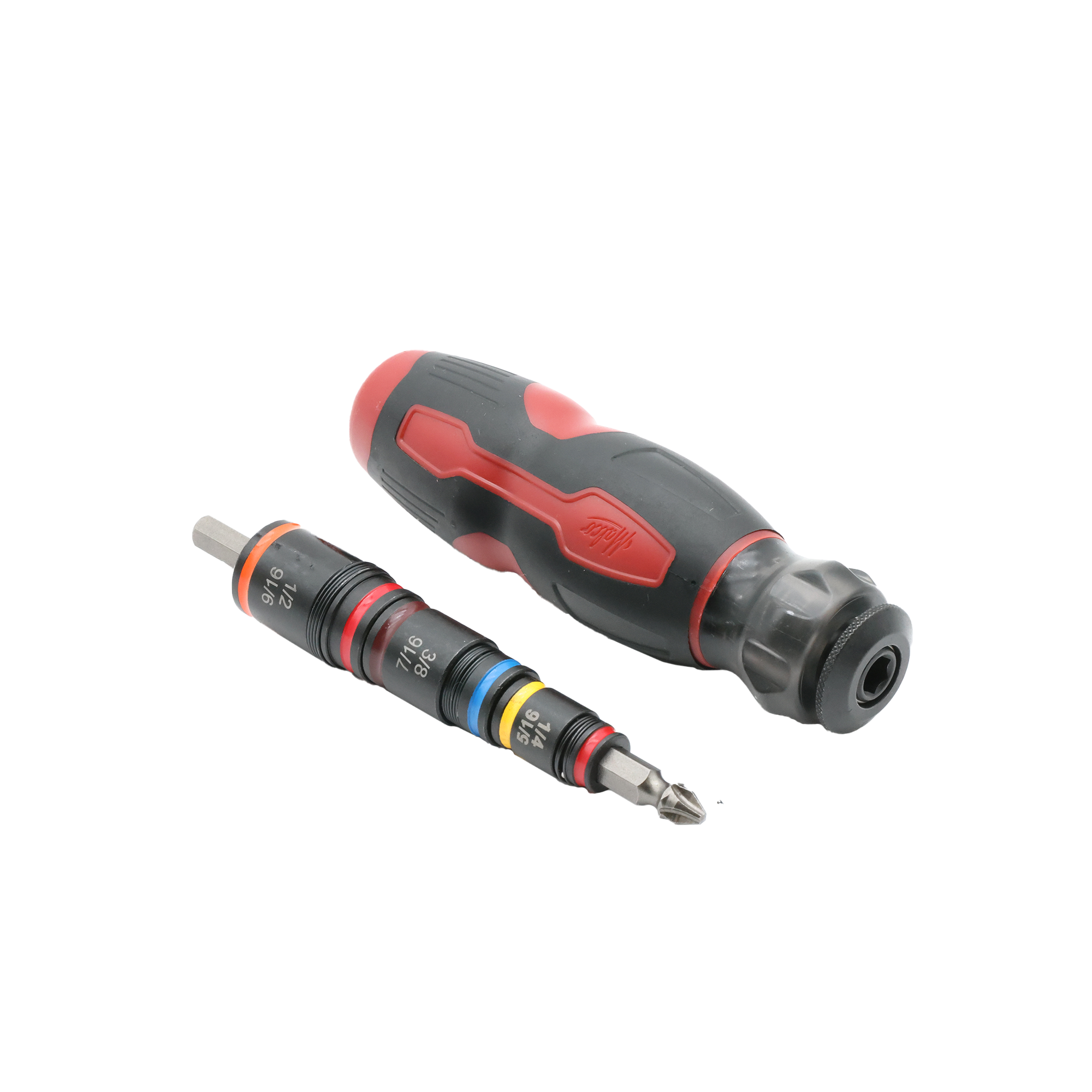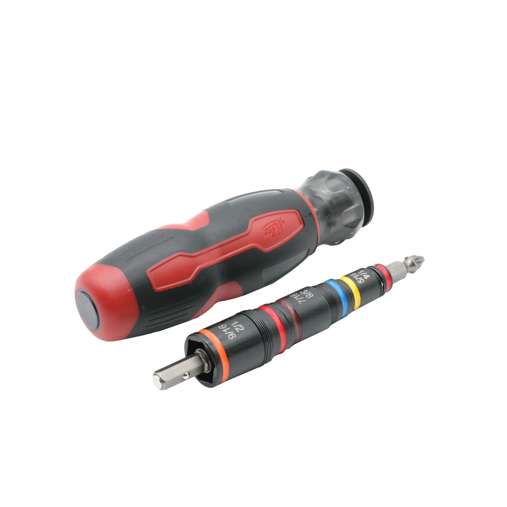 The 7-in-1 Flip Bit Socket set features six cleanable, reversible socket sizes: ¼""-5/16"", 3/8""-7/16"", and ½""-9/16"", strong storage shaft retention and an integrated #2 Phillips bit providing unmatched adaptability for various tasks. The ultra-powerful magnet ensures a secure hold on fasteners, improving precision and efficiency on the job.