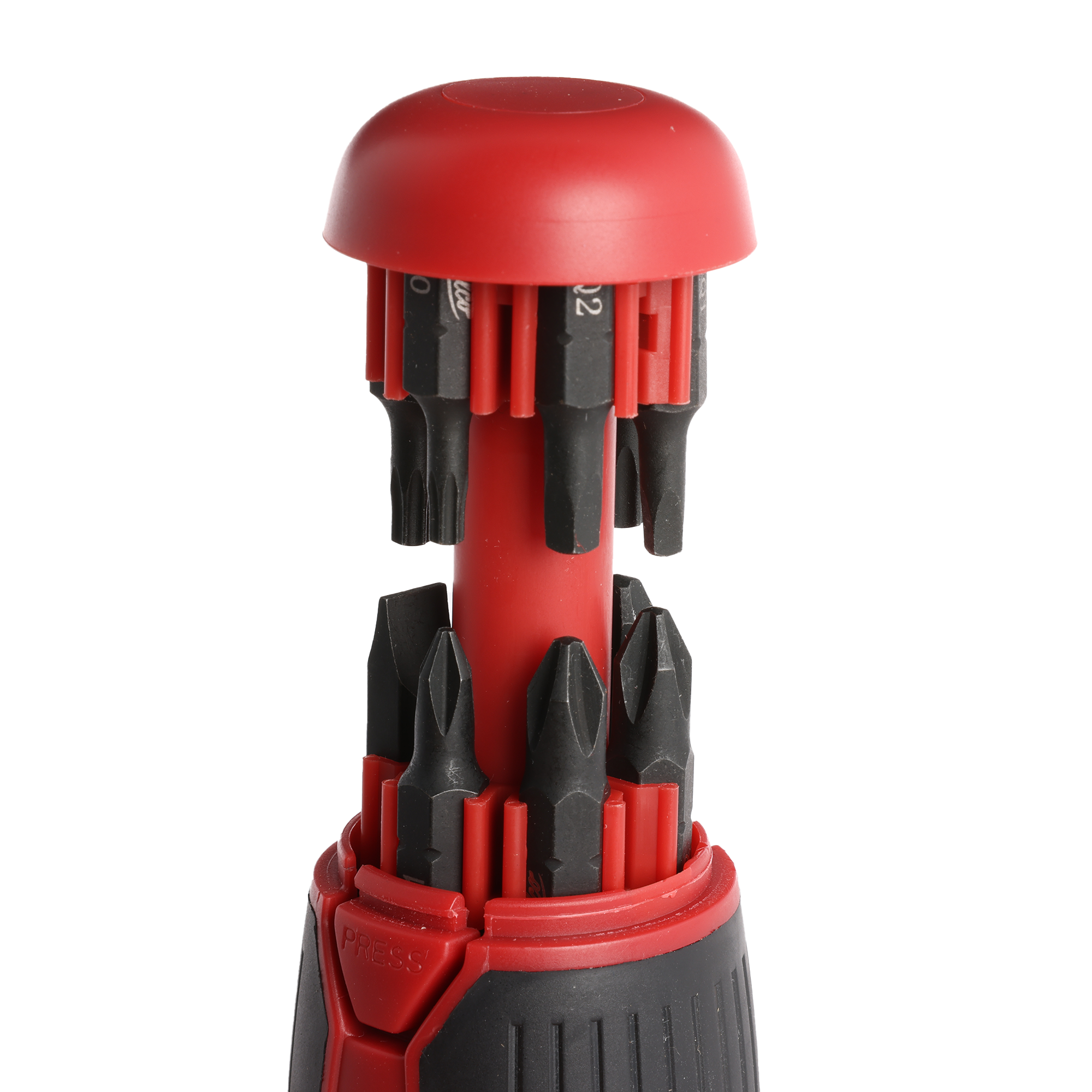 Compatible with standard ¼" hex drivers, the handle comes pre-loaded with a 12 impact rated bits, including: