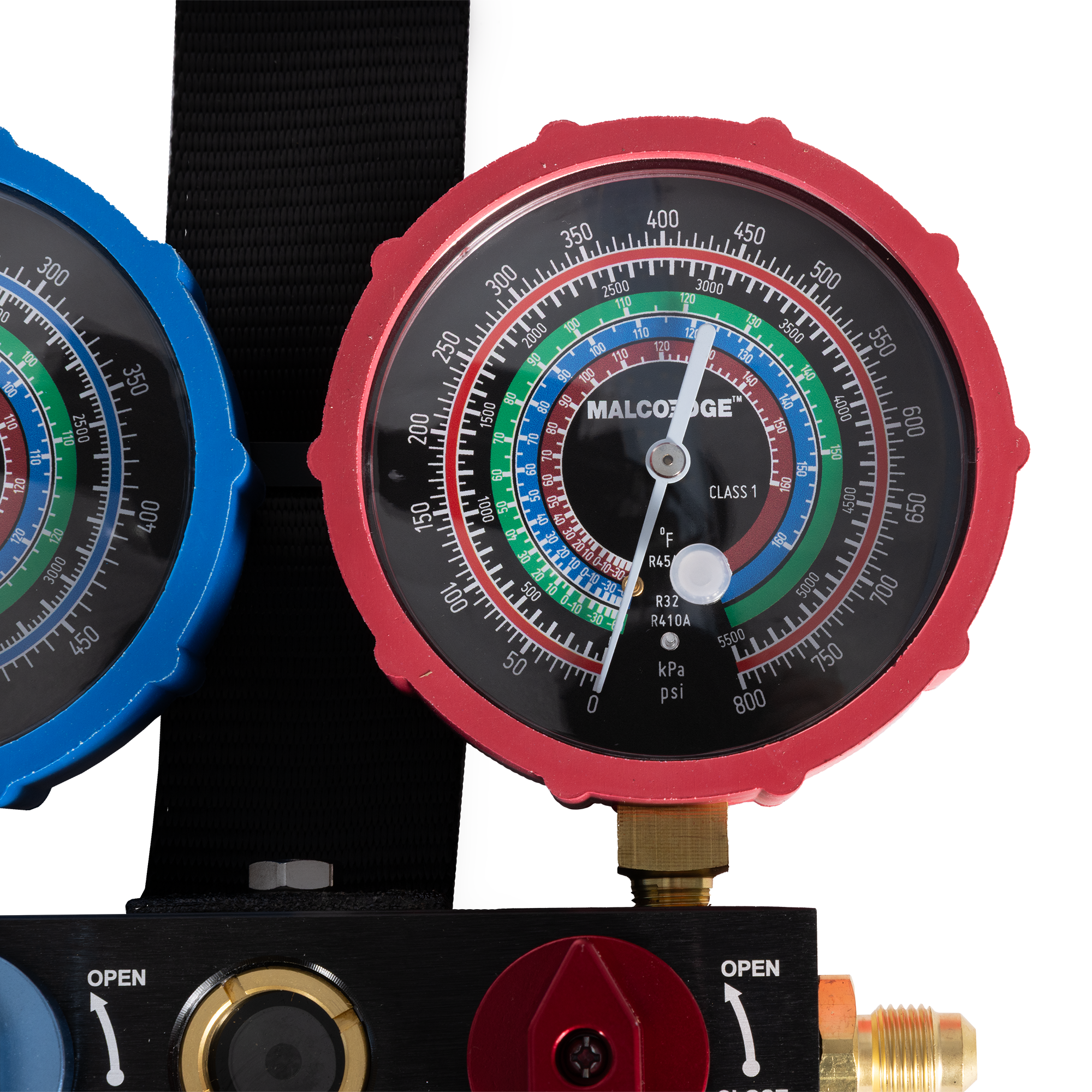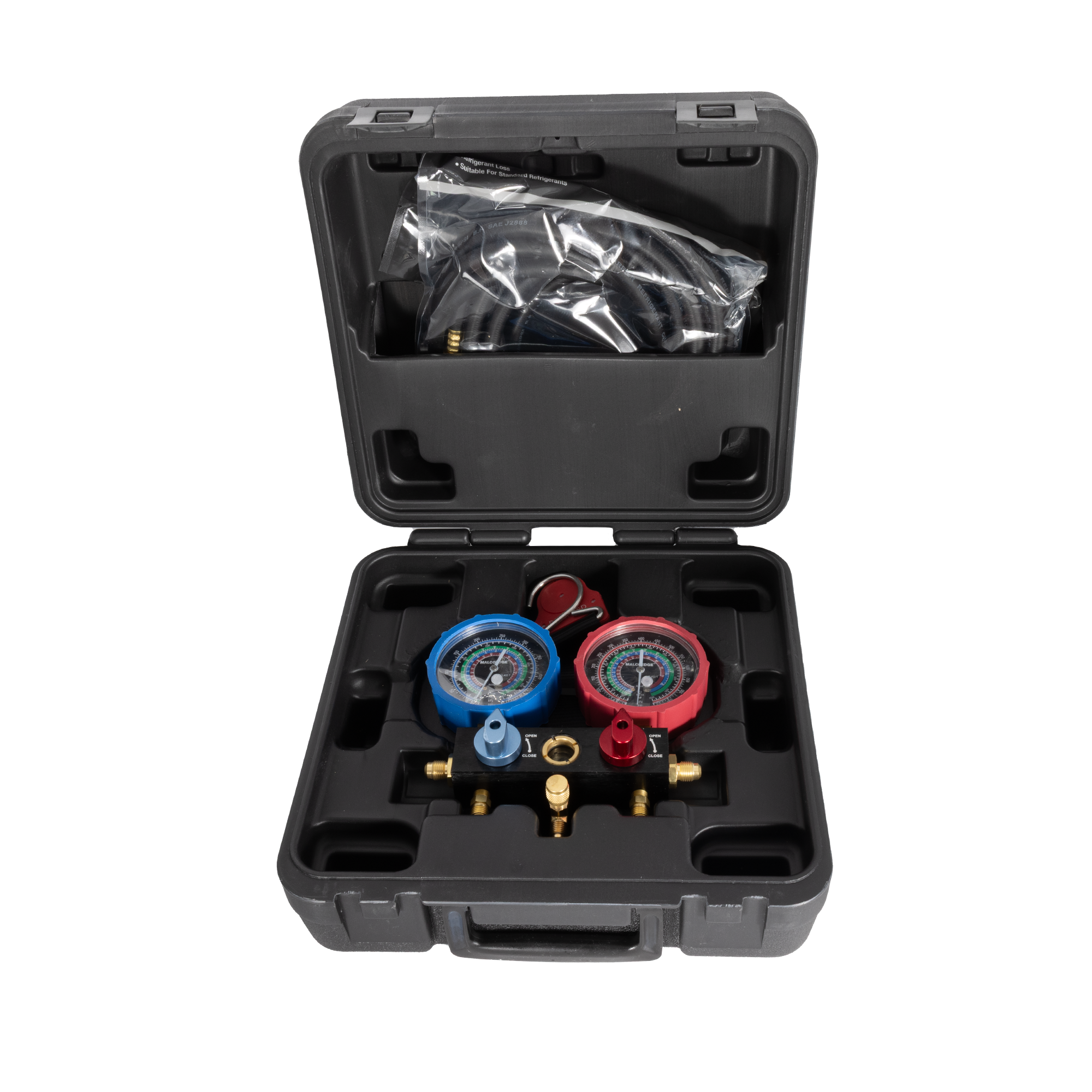 The MalcoEdge™ M2VKA2L A2L 2-Valve Manifold Kit is built for safe, efficient service of systems using R32, R410A, and R454B refrigerants. This professional-grade kit includes a 2-valve manifold with a built-in sight-glass for easy monitoring, quick 1/4-turn valves with a patented spring design for extended durability, and a magnetic strap with hook for hands-free operation. The included Safe Seal hose set prevents refrigerant loss and exposure, reducing the risk of burns and leaks. All components come packed in a durable carry case, making this the go-to kit for HVAC techs servicing modern A2L systems.