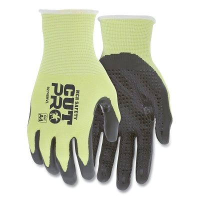 Introducing the MCR Safety VP92748HVXS CutPro 92748HV 18-ga HyperMax Nitrile-Dotted Coated Gloves in a vibrant Hi-Vis Lime color, designed to offer exceptional protection and comfort for your hands. Perfect for various applications, these gloves ensure you're not only safe but also visible in any working environment.