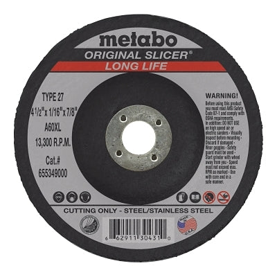 Metabo 655349000 Slicer Cutting Wheel, Type 27, 4 1/2 in Dia, 1/16 in Thick, 36 Grit Alum. Oxide