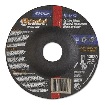 Norton 66252841912 Gemini RightCut Right Angle Cut-Off Wheel, Type 27/42, 4-1/2 in dia x 0.045 in Thick x 7/8 in Arbor, 25 EA/PK