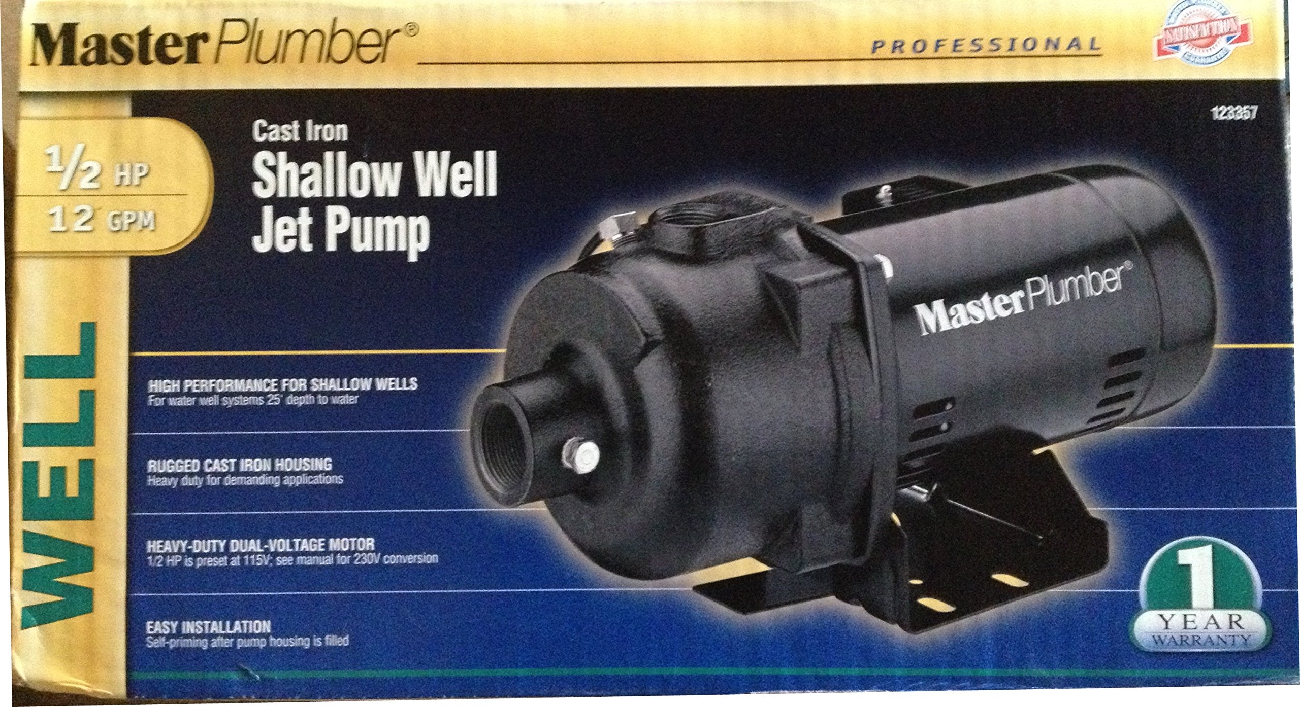 Master plumber, 1/2 hp, 115V, shallow well jet pump, cast iron tefc, 30-50 pressure switch, water depths to 25', reliable performance at 25' depth to water or less, maximum pressures of 63 psi, maximum pumping capacities to 5.1 gpm pump, housing is constructed of heavy duty cast iron & is ready to install, fan cooled, completely enclosed motor, 1-1/4 inch suction port & 1 inch discharge port.