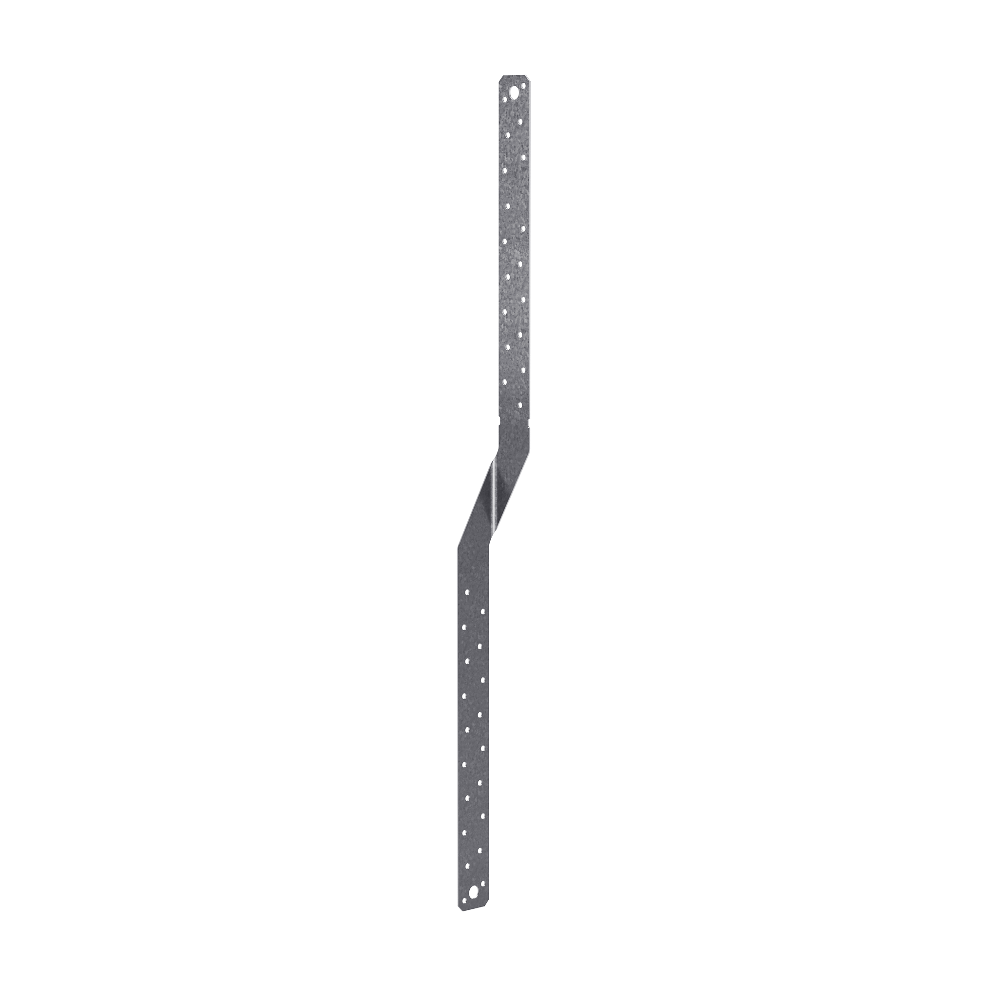 The Simpson Strong-Tie MTS24C-REV 24IN MEDIUM TWIST STRAP - REVERSE BEND is an essential component for enhancing structural integrity in construction projects. Designed to provide a robust tension connection between two members, this medium twist strap is ideal for resisting moderate uplift loads, especially at the rafter or heel of a truss. Its innovative reverse bend design minimizes interference at transition points, making it a practical choice for various framing applications.