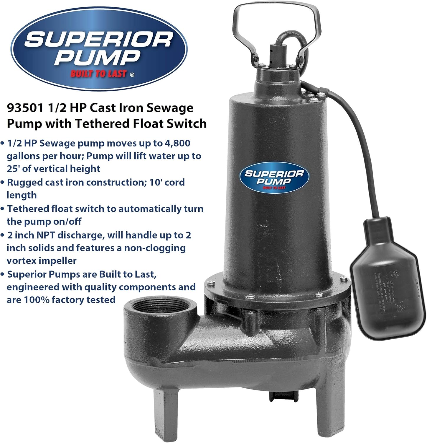 Experience unparalleled performance and reliability with the Superior Pump 93015-U Cast Iron Tethered Float Switch Sewage Pump. Designed to tackle the toughest sewage applications, this powerhouse pump features a robust 1/2 HP motor that efficiently handles waste removal while ensuring optimal longevity.