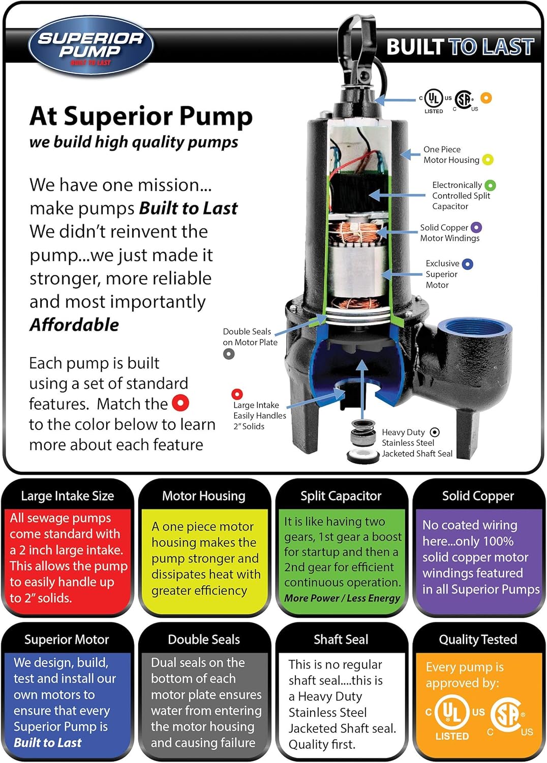 The Superior Pump 93015-U is engineered with high-quality components that guarantee durability and efficiency. Its solid copper motor windings enhance conductivity, while the heavy-duty stainless steel jacketed shaft seals protect against leaks and wear. With double O-ring seals on the motor plate, you can trust that this pump will maintain its integrity under pressure.