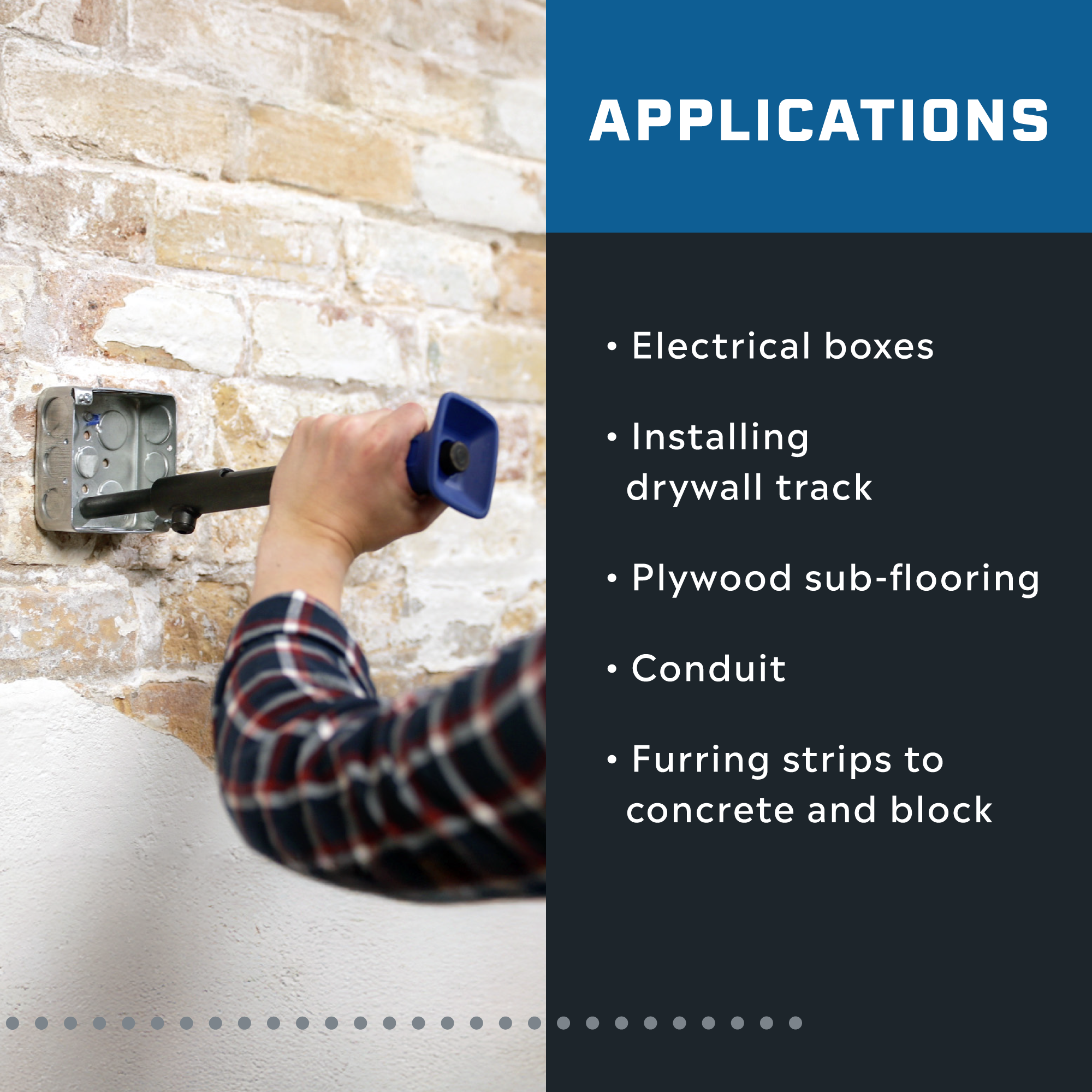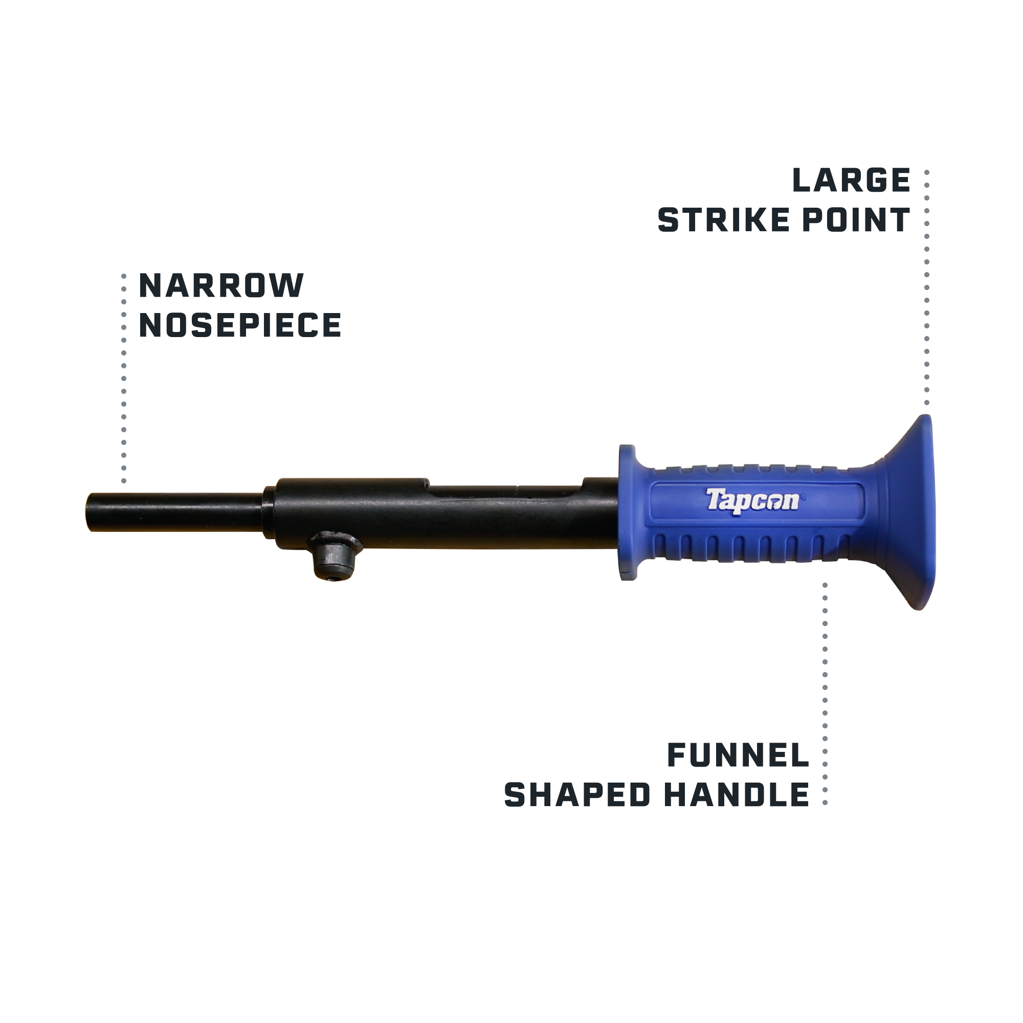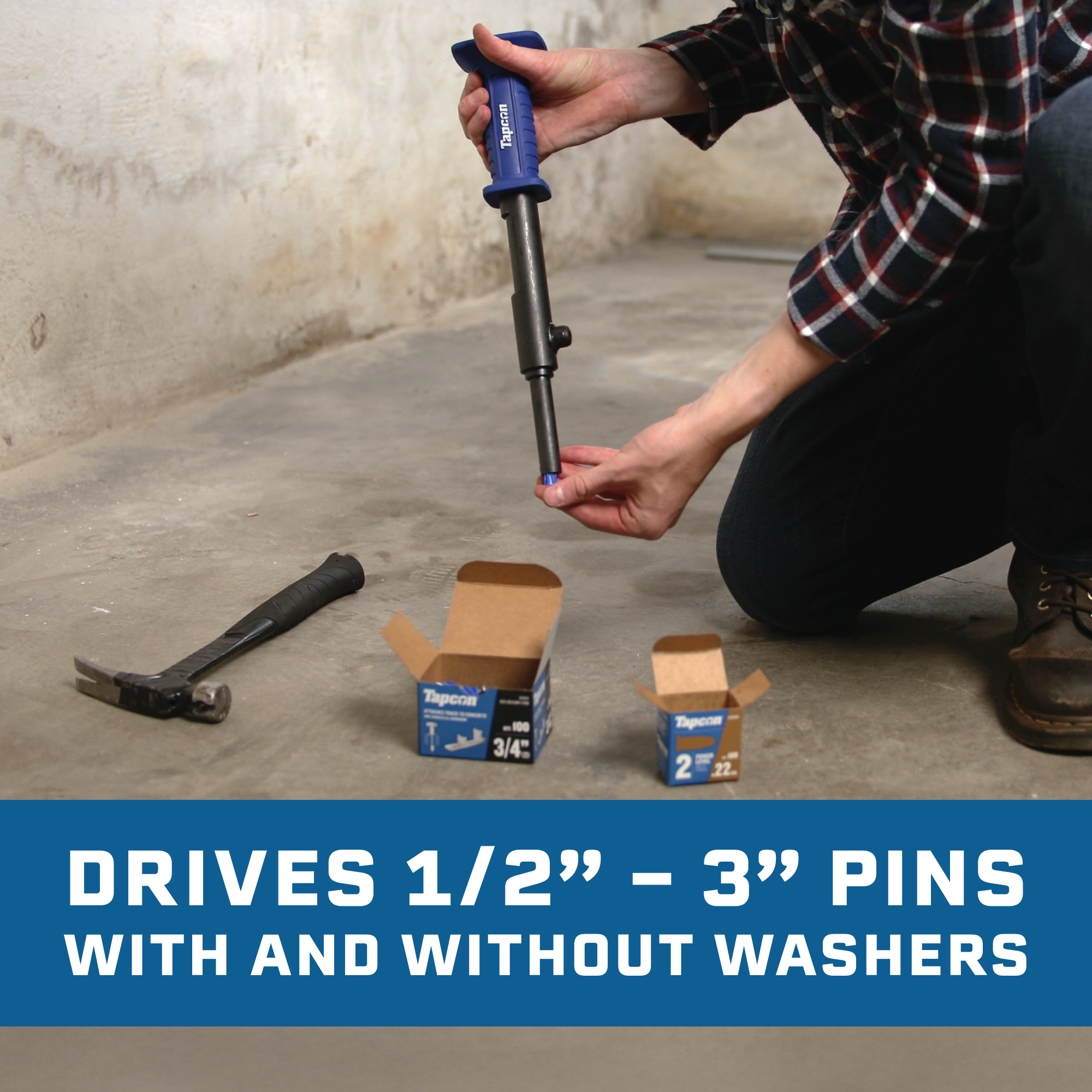 Tapcon HS22 0.22 Caliber Single Shot Powder Actuated Hammer Tool is the occasional-use powder-actuated tool engineered for simplicity and accuracy. The large striking surface reduces misses and increases accuracy on occasional-use applications. The impact-resistant handle with contoured finger grooves provides greater operator comfort and control. With 3-inch capacity, it's versatile for various applications. Compatible with brown, green, and yellow 0.22 caliber single-shot loads for flexible power adjustment across concrete, concrete block, and hard aggregate substrates. Perfect for wood framing, furring strips, electrical boxes, and tightly spaced applications. Engineered to endure in demanding substrates.