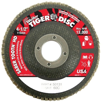 Weiler 50131 Tiger Saber Tooth Ceramic High Density Flap Disc, 4-1/2 in dia, 60 Grit, 7/8 in Arbor, 13,000 RPM, Type 27