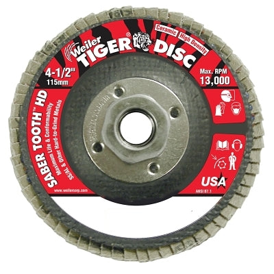 Weiler 50134 Tiger Saber Tooth Ceramic High Density Abrasive, 4-1/2 in dia, 60 Grit, 5/8 in-11 UNC Nut, 13,000 RPM, Type 27