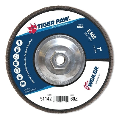 Weiler 51142 Tiger Paw Coated Abrasive Flap Discs, 7", 60 Grit, 5/8 Arbor, Phenolic Back