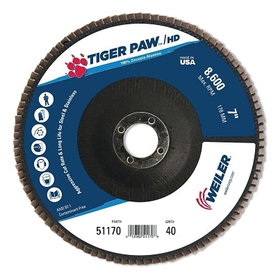 Weiler 51170 Tiger Paw Super High Density Flap Disc, 7 in dia, 40 Grit, 7/8 in Arbor, 8600 RPM, Type 27 Flat