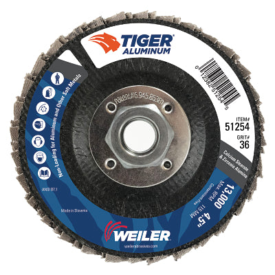 Weiler 51254 Trimmable Tiger Flap Disc, 4-1/2 in dia, 36 grit, 5/8 in to 11 in arbor, 13000 RPM